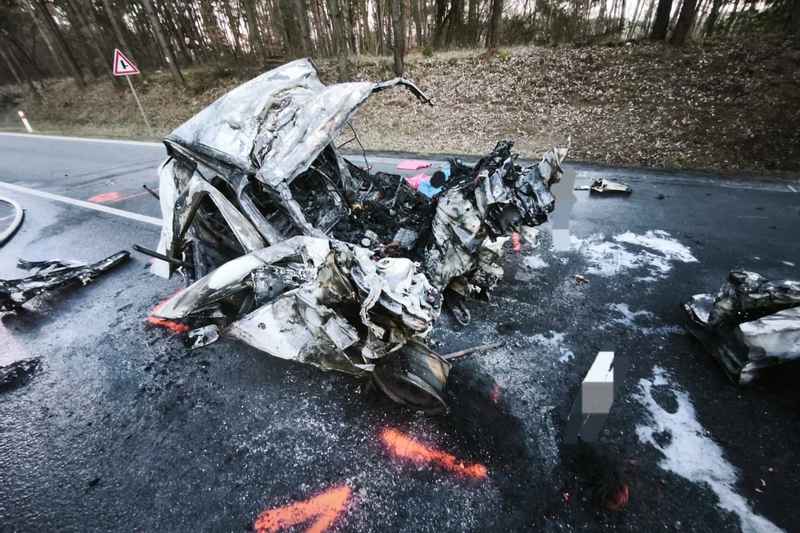 Řidič osobního vozu neměl šanci přežít čelní střet a následný požár.