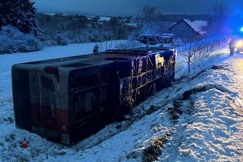 AKTUÁLNĚ: Autobus skončil na boku v poli, hasiči vyprostili třináct cestujících