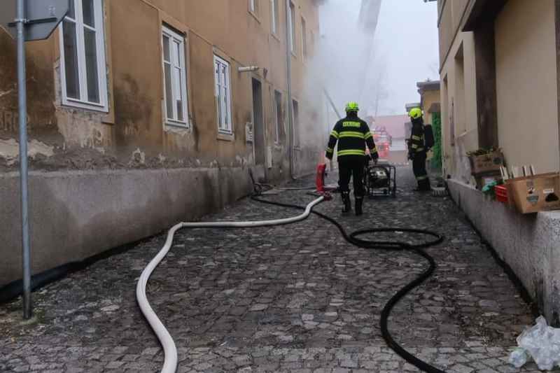 Hasiči museli nasadit i automobilový žebřík a rozebírat střešní konstrukci.