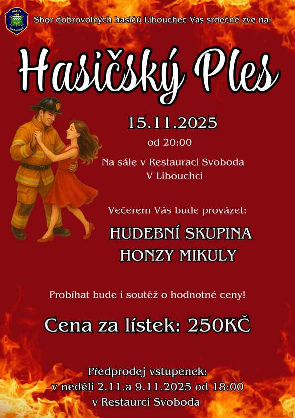 Sbor dobrovolných hasičů Libouchec Vás srdečně zve do Kulturního domu Svoboda v Libouchci na hasičský ples. K tanci zahraje Hudební skupina Honzy Mikuly. Nemůže chybět tradiční tombola a soutěž o hodnotné ceny.