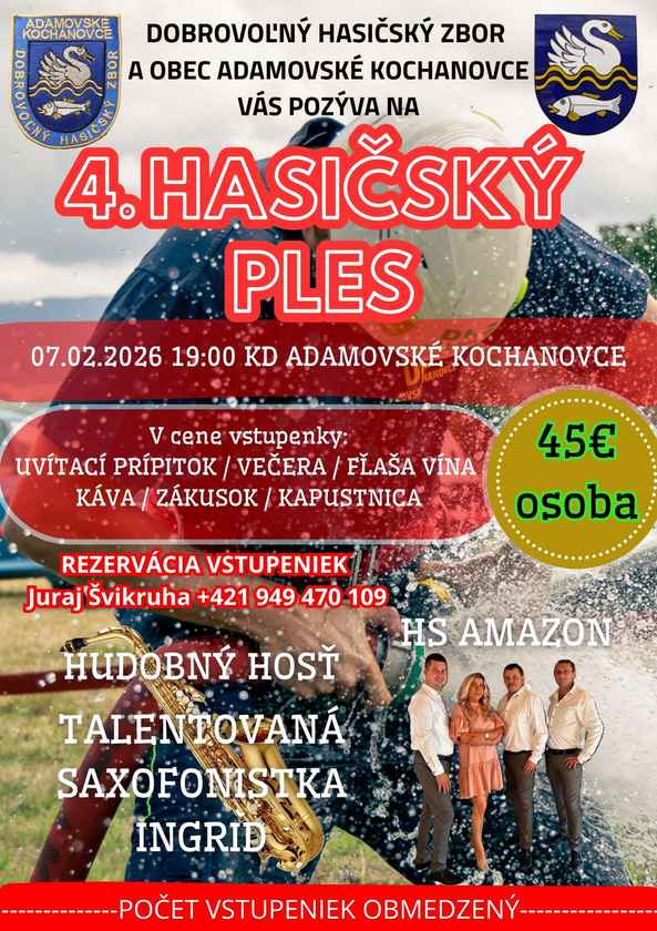 4. Hasičský ples Adamovské Kochanovce Kdy: 7. 2. 2026 19:00 Kde: Adamovské Kochanovce Kraj: Celá ČR Typ akce: kulturní Zpět na kalendář Zobrazit mapu