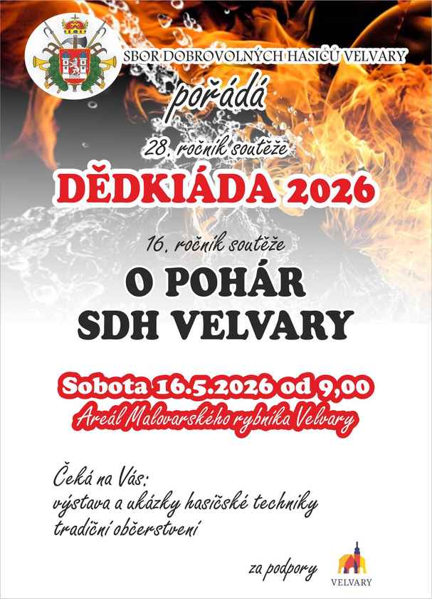Zveme Vás na naší tradiční soutěž v požárním sportu Dědkiádu, která se bude konat v sobotu 16. 5. 2026 v areálu Malovarského rybníka ve Velvarech.