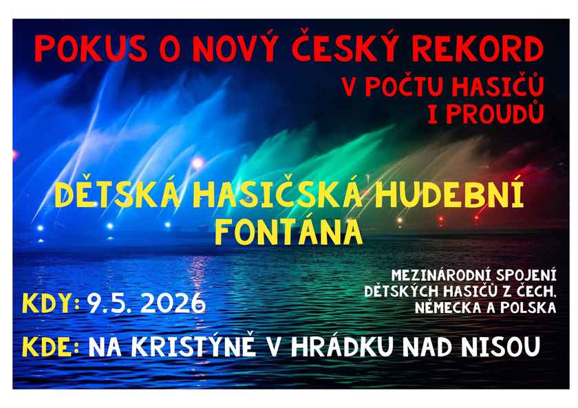 Dětská hasičská hudební fontána Kdy: 9. 5. 2026 15:00 Kde: Na Krystýně, Hrádek nad Nisou Kraj: Liberecký Typ akce: ostatní Zpět na kalendář Zobrazit mapu