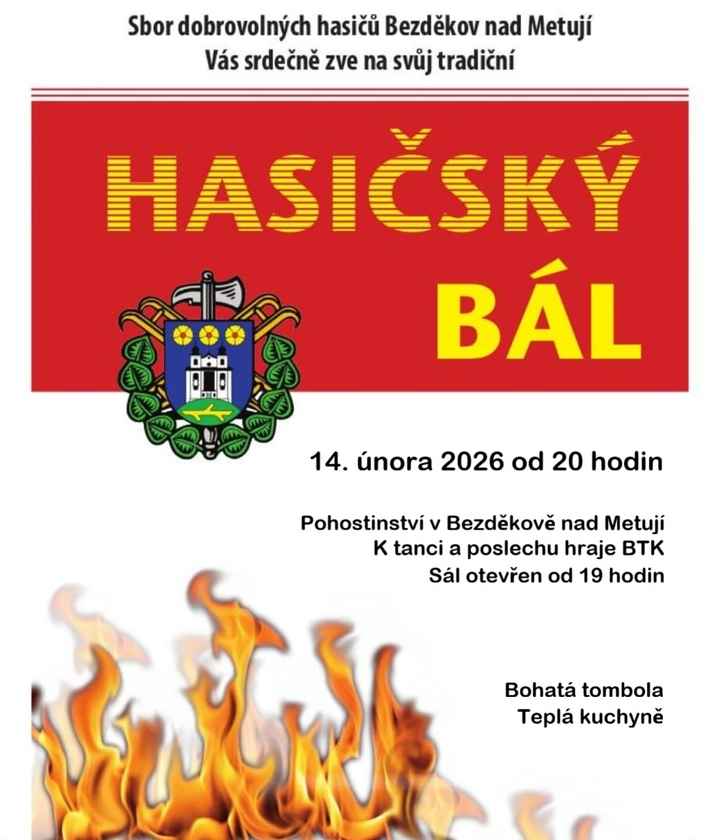 Hasičský bál Bezděkov nad Metují 2026 Kdy: 14. 2. 2026 20:00 Kraj: Královehradecký Typ akce: kulturní Zpět na kalendář Zobrazit mapu