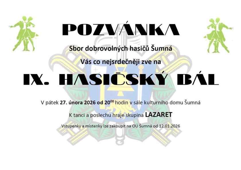 Hasičský bál IX. Šumná Kdy: 27. 2. 2026 20:00 Kraj: Jihomoravský Typ akce: kulturní Zpět na kalendář Zobrazit mapu