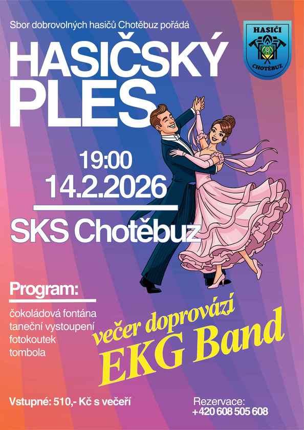 Hasičský ples Chotěbuz 2026 Kdy: 14. 2. 2026 19:00 Kraj: Moravskoslezský Typ akce: kulturní Zpět na kalendář Zobrazit mapu
