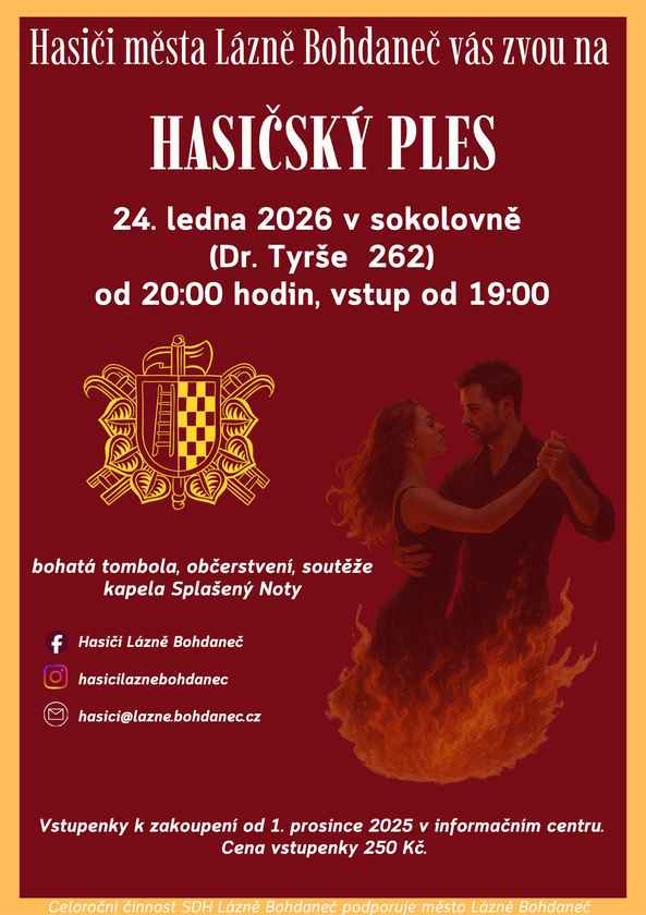 Hasičský ples Lázně Bohdaneč Kdy: 24. 1. 2026 19:00 Kraj: Pardubický Typ akce: kulturní Zpět na kalendář Zobrazit mapu