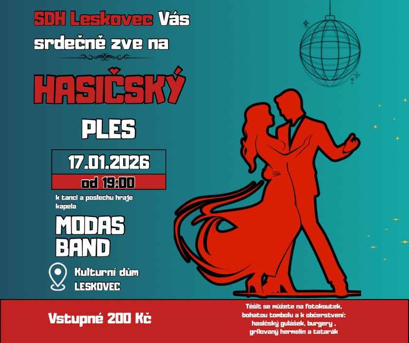 Hasičský ples Leskovec Kdy: 17. 1. 2026 19:00 Kraj: Zlínský Typ akce: kulturní Zpět na kalendář Zobrazit mapu