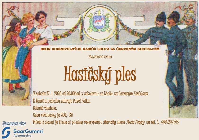 Hasičský ples Lhota za Červeným Kostelcem Kdy: 17. 1. 2026 20:00 Kraj: Královehradecký Typ akce: kulturní Zpět na kalendář Zobrazit mapu