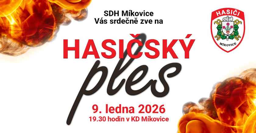 Hasičský ples Mikovice Kdy: 9. 1. 2026 19:30 Kraj: Zlínský Typ akce: kulturní Zpět na kalendář Zobrazit mapu