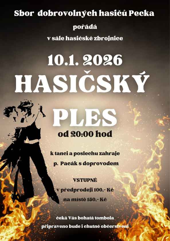 Hasičský ples SDH Pecka Kdy: 10. 1. 2026 20:00 Kraj: Královehradecký Typ akce: kulturní Zpět na kalendář Zobrazit mapu