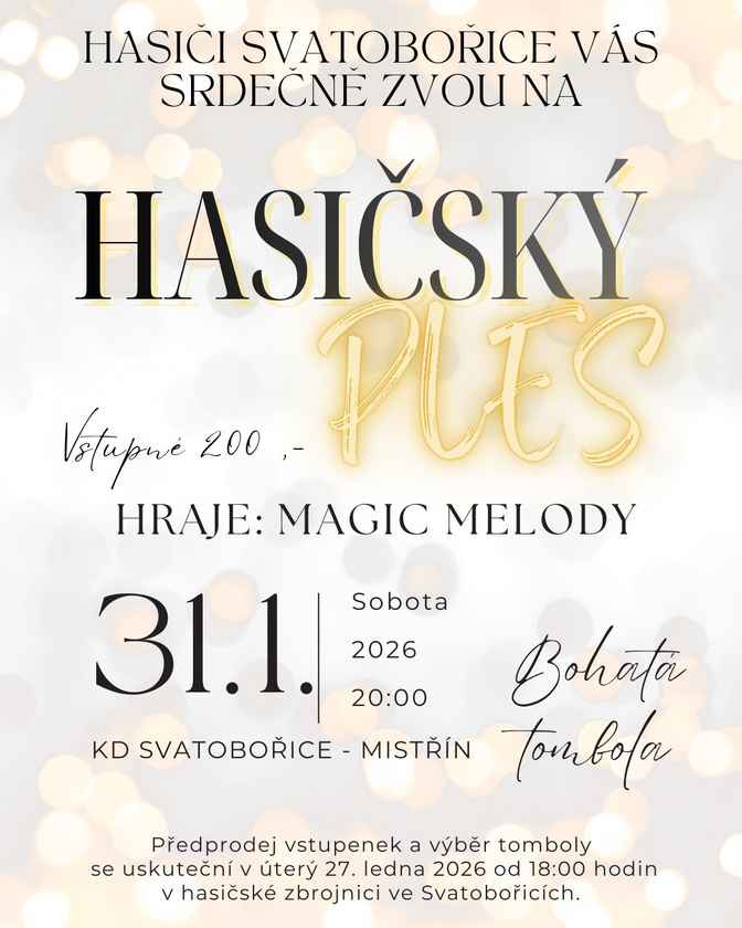 Hasičský ples Svatobořice 2026 Kdy: 31. 1. 2026 20:00 Kraj: Jihomoravský Typ akce: kulturní Zpět na kalendář Zobrazit mapu