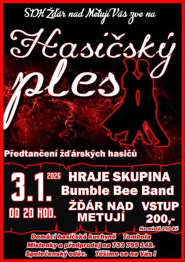 Hasičský ples Ždár nad Metují Kdy: 3. 1. 2026 20:00 Kraj: Královehradecký Typ akce: kulturní Zpět na kalendář Zobrazit mapu