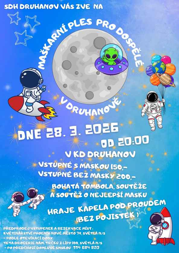 Maškarní ples pro dospělé Kdy: 28. 3. 2026 20:00 – 1. 3. 2026 04:00 Kde: Druhanov 11 - kulturní dům Kraj: Vysočina Typ akce: kulturní Zpět na kalendář Zobrazit mapu