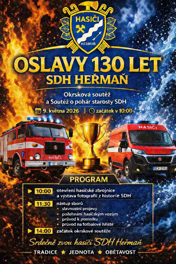 Oslavy 130 let SDH Heřmaň Kdy: 9. 5. 2026 10:00 Kde: Heřmaň Kraj: Jihočeský Typ akce: kulturní Zpět na kalendář Zobrazit mapu
