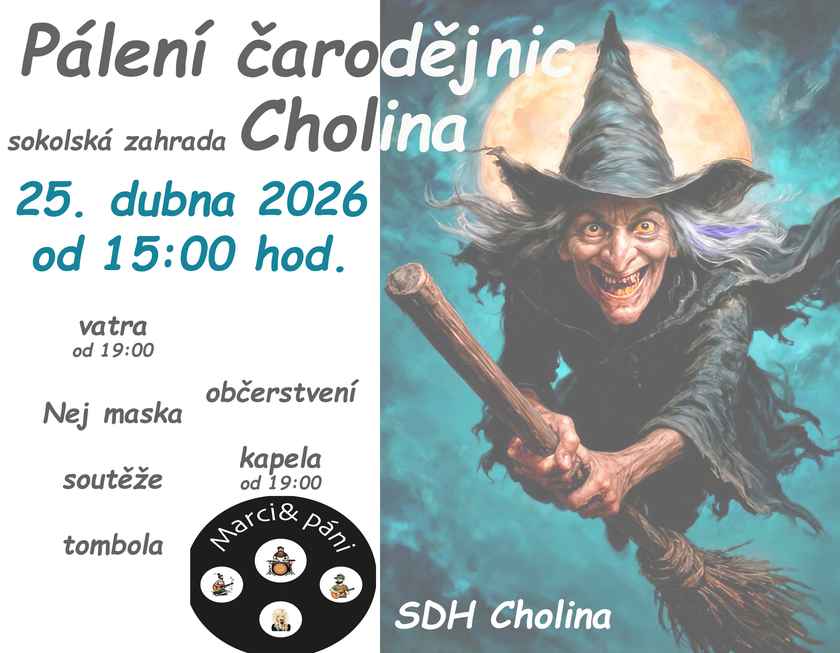Pálení čaroděnic SDH Cholina Kdy: 25. 4. 2026 15:00 Kde: sokolská zahrada Kraj: Olomoucký Typ akce: kulturní Zpět na kalendář Zobrazit mapu