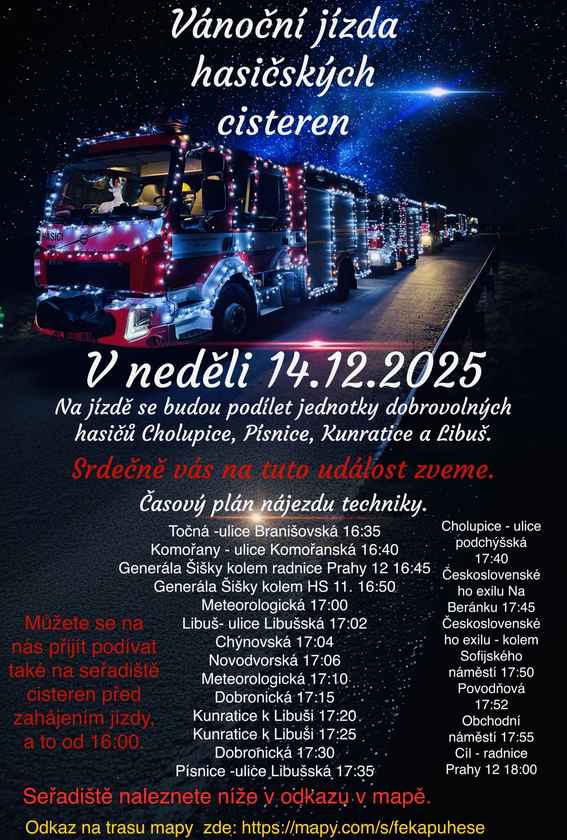 Vánoční jízda hasičských cisteren 2025 Kdy: 14. 12. 2025 16:30 Kde: Praha - Cholupice, Písnice, Kunratice, Libuš Kraj: Praha Typ akce: kulturní Zpět na kalendář Zobrazit mapu