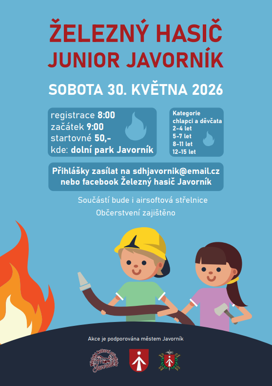 Železný hasič junior 2026 Kdy: 30. 5. 2026 09:00 – 30. 5. 2026 16:00 Kde: Dolní park Javorník Kraj: Olomoucký Typ akce: sportovní Zpět na kalendář