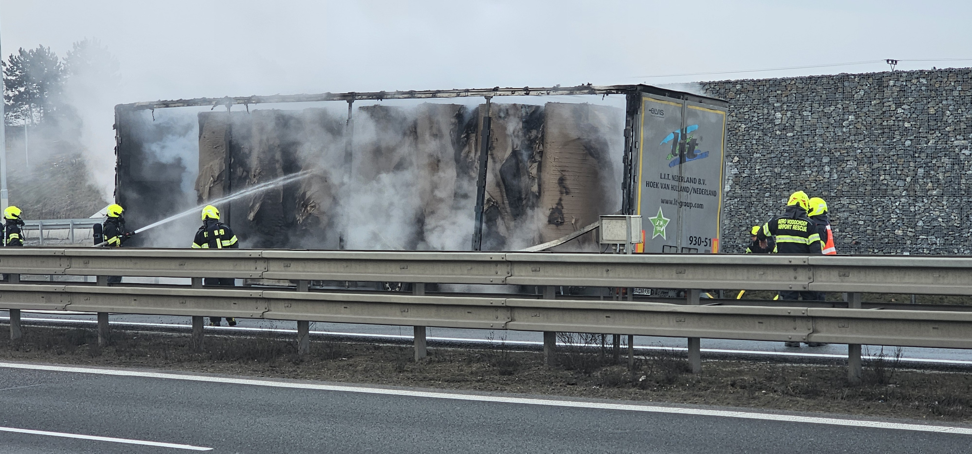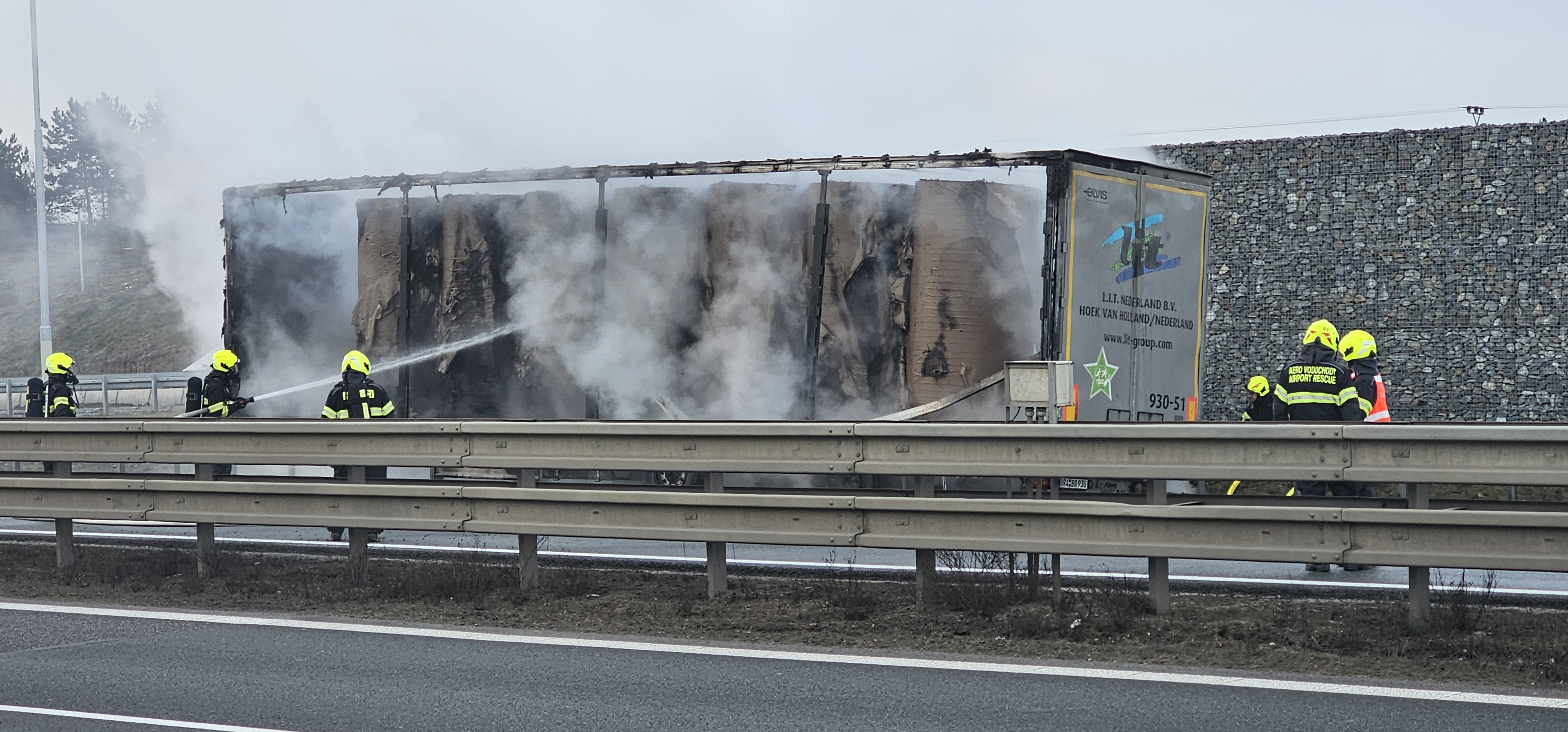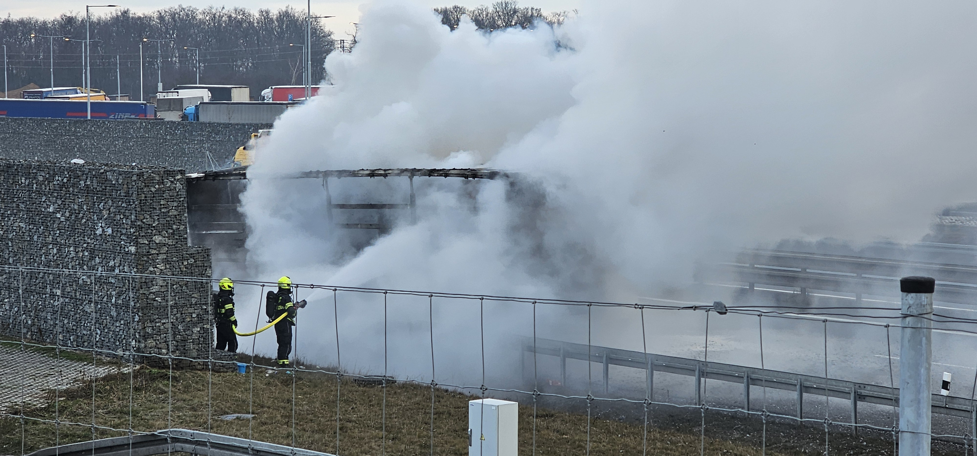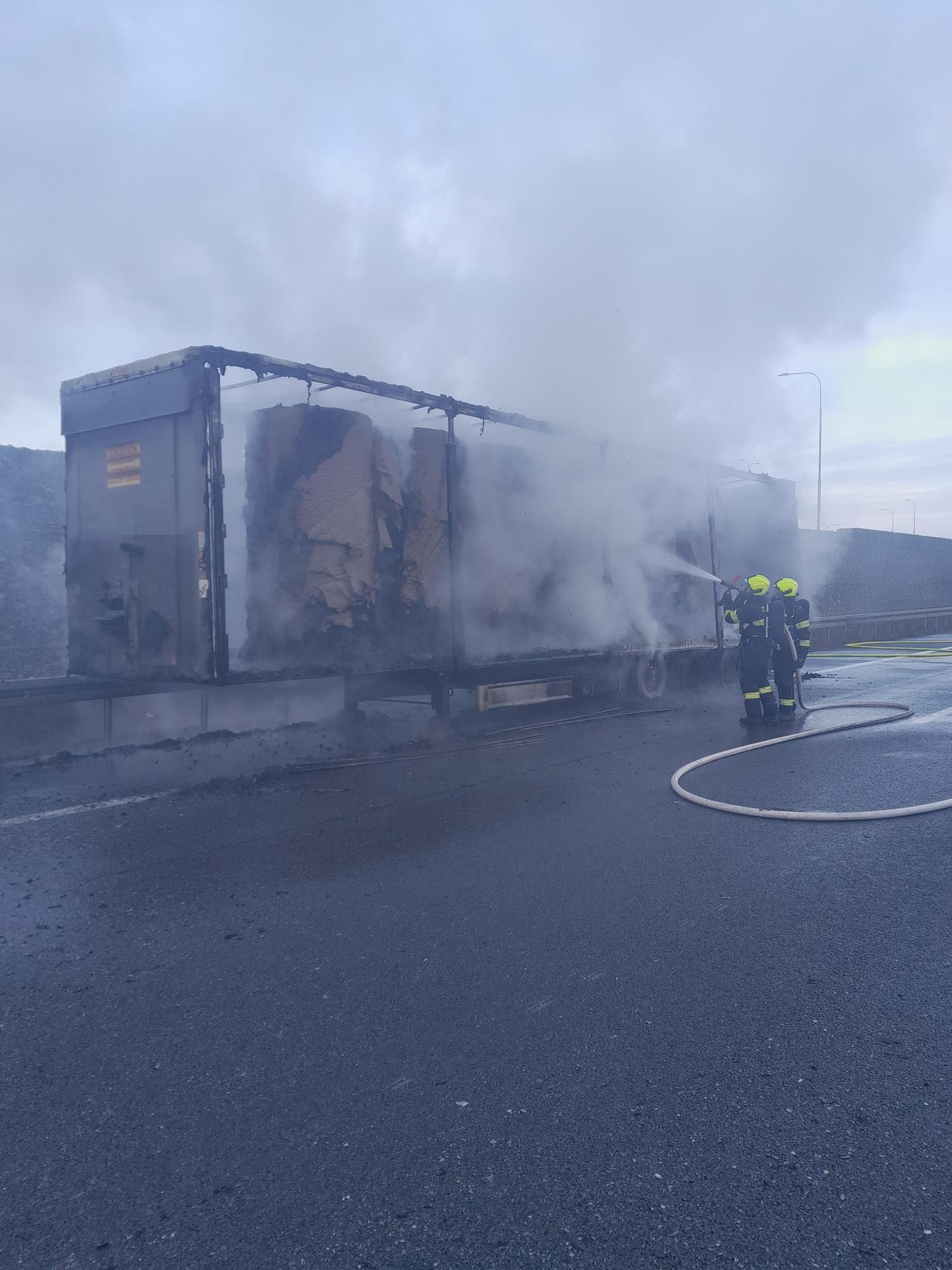 Na místě hořel v odstavném pruhu návěs kamionu, který převážel lisovaný papír v rolích. Tento materiál se obecně velmi špatně hasí a k jeho uhašení je potřeba větší množství hasebních látek, v tomto případě vody, proto došlo během hasebních prací k uzavření pruhu dálnice.