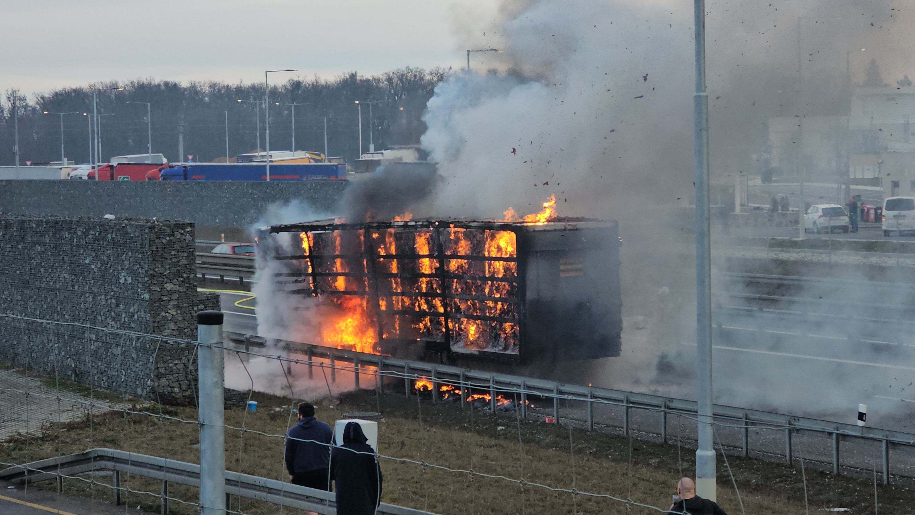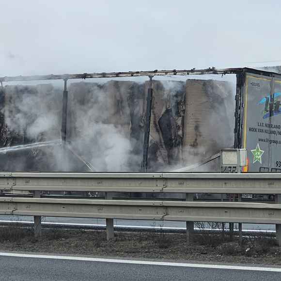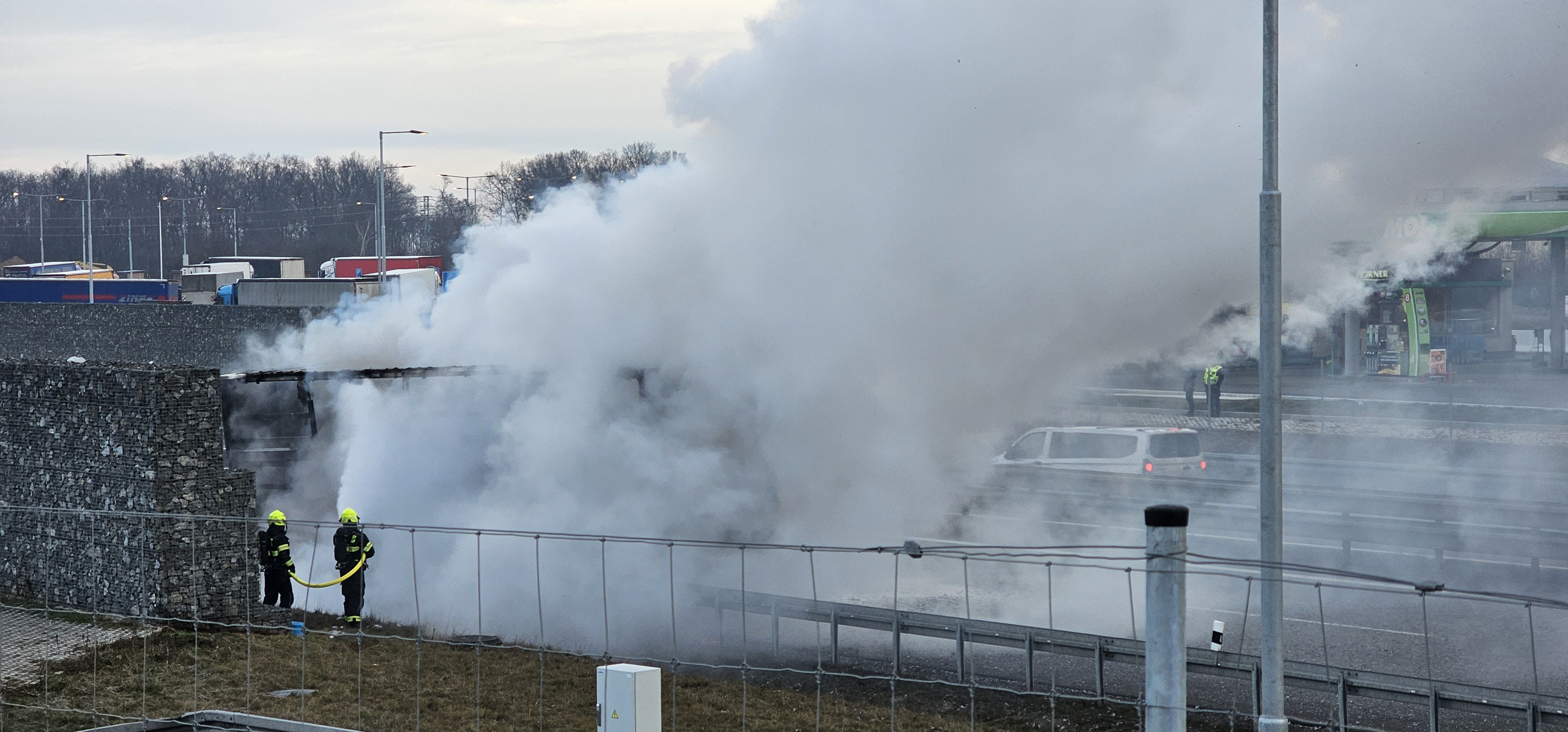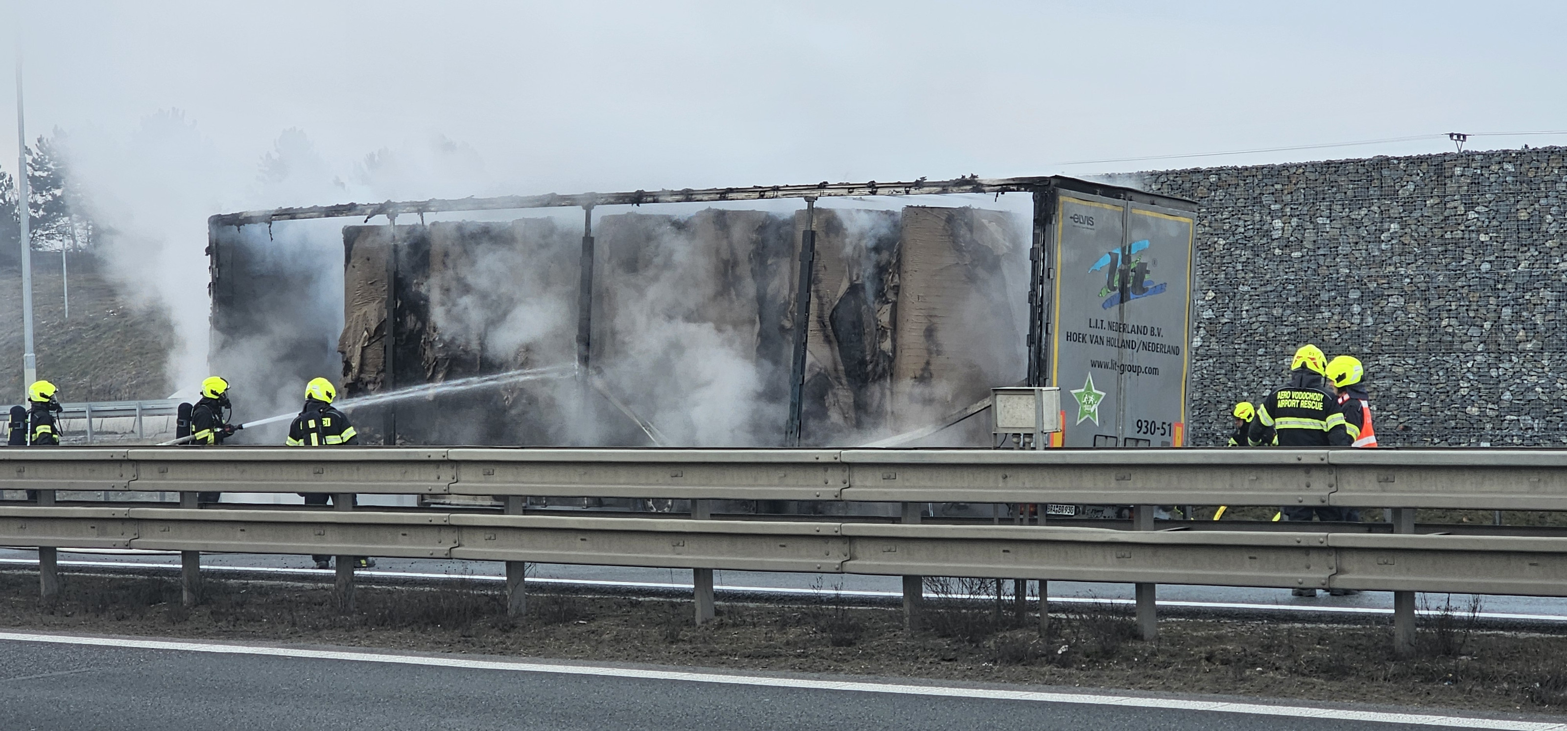 Na místě hořel v odstavném pruhu návěs kamionu, který převážel lisovaný papír v rolích. Tento materiál se obecně velmi špatně hasí a k jeho uhašení je potřeba větší množství hasebních látek, v tomto případě vody, proto došlo během hasebních prací k uzavření pruhu dálnice.