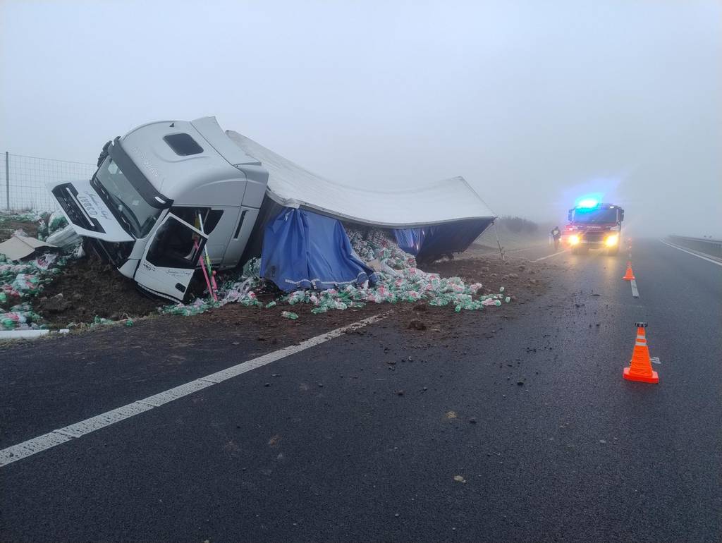 Na 79. kilometru dálnice D6 zasahují hasiči u dopravní nehody kamionu, který skončil na boku. Řidič je v péči záchranářů, provoz komplikuje vysypaný náklad i hustá mlha.