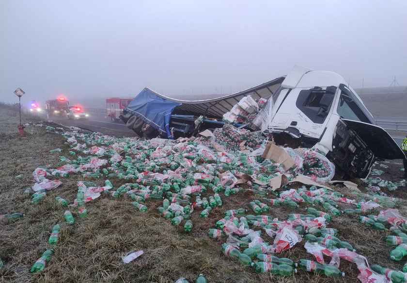 AKTUÁLNĚ: Kamion se převrátil na D6 u Lubence, náklad PET lahví blokuje jízdní pruh