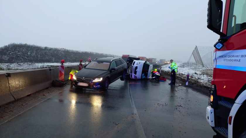 "Na místě zasahujeme společně s dalšími složkami IZS. Podle prvotních informací mělo dojít k převrácení soupravy a následnému zablokování obou směrů komunikace, tudíž je komunikace pro tuto chvíli kompletně uzavřena," uvedl mluvčí policie.