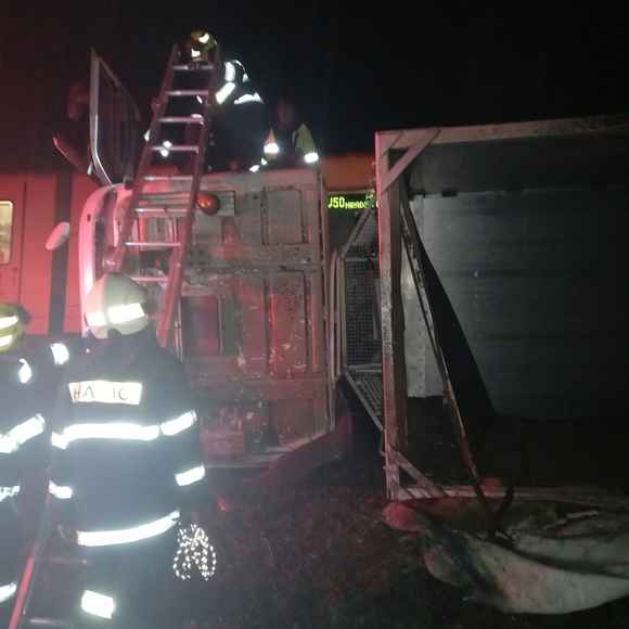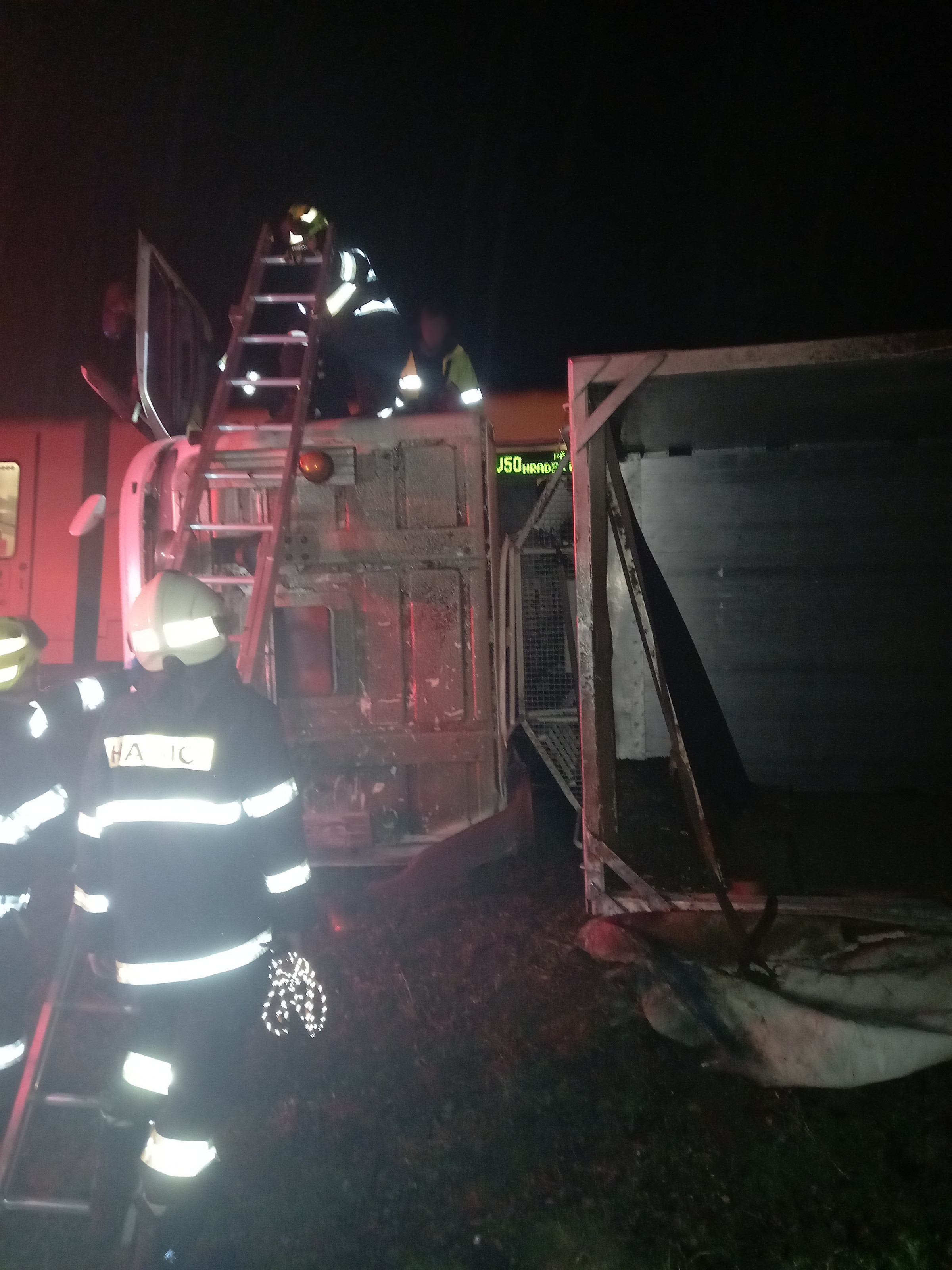 Kamion po střetu zůstal převrácený na boku. Hasiči řidiči pomohli bezpečně vystoupit z kabiny pomocí nastavovacího žebříku. Následně zajistili místo nehody a zahájili další nutná opatření.