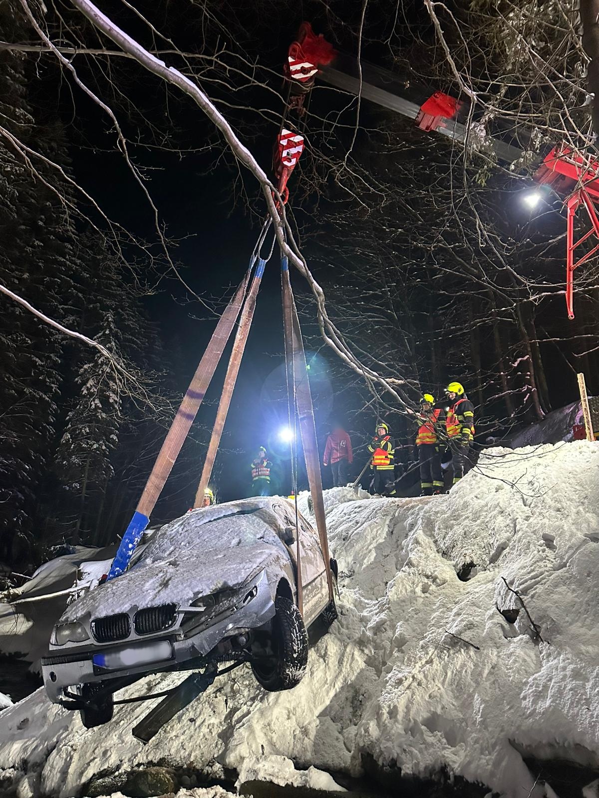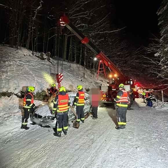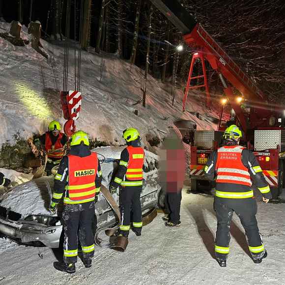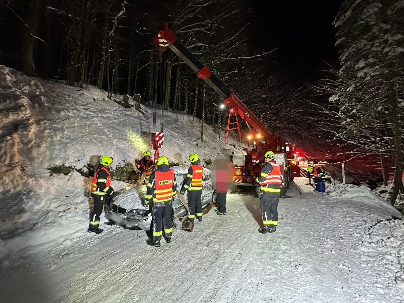 Za pomoci ramene jeřábu se jim podařilo havarované auto, které už bylo navíc zapadané sněhem, vyprostit z obtížně přístupného místa a dostat zpět na silnici. Celý zásah trval přibližně 45 minut a kolem půl desáté večer se jednotky vracely zpět na své základny.