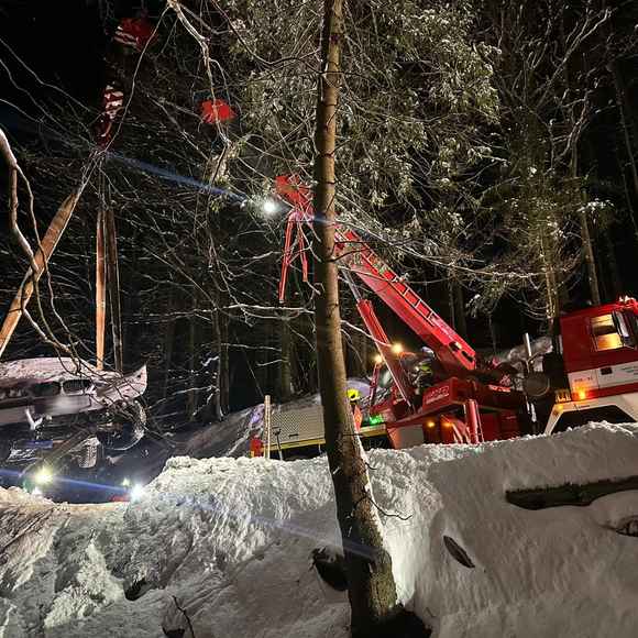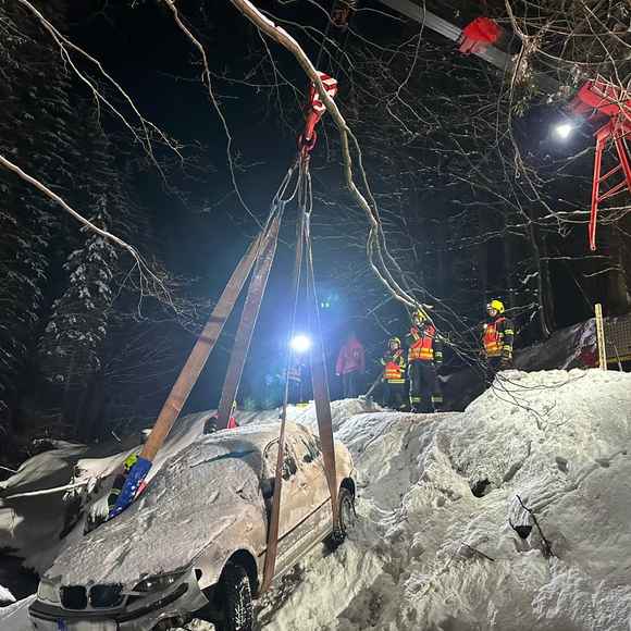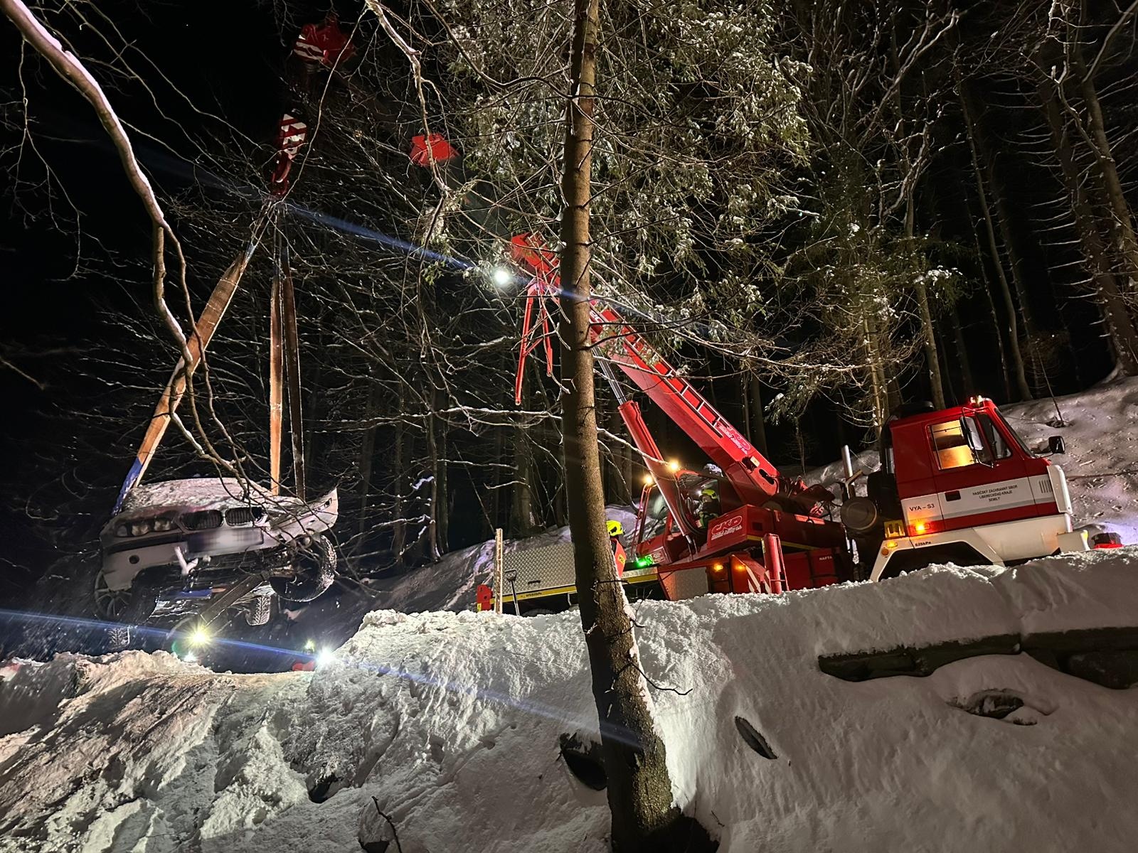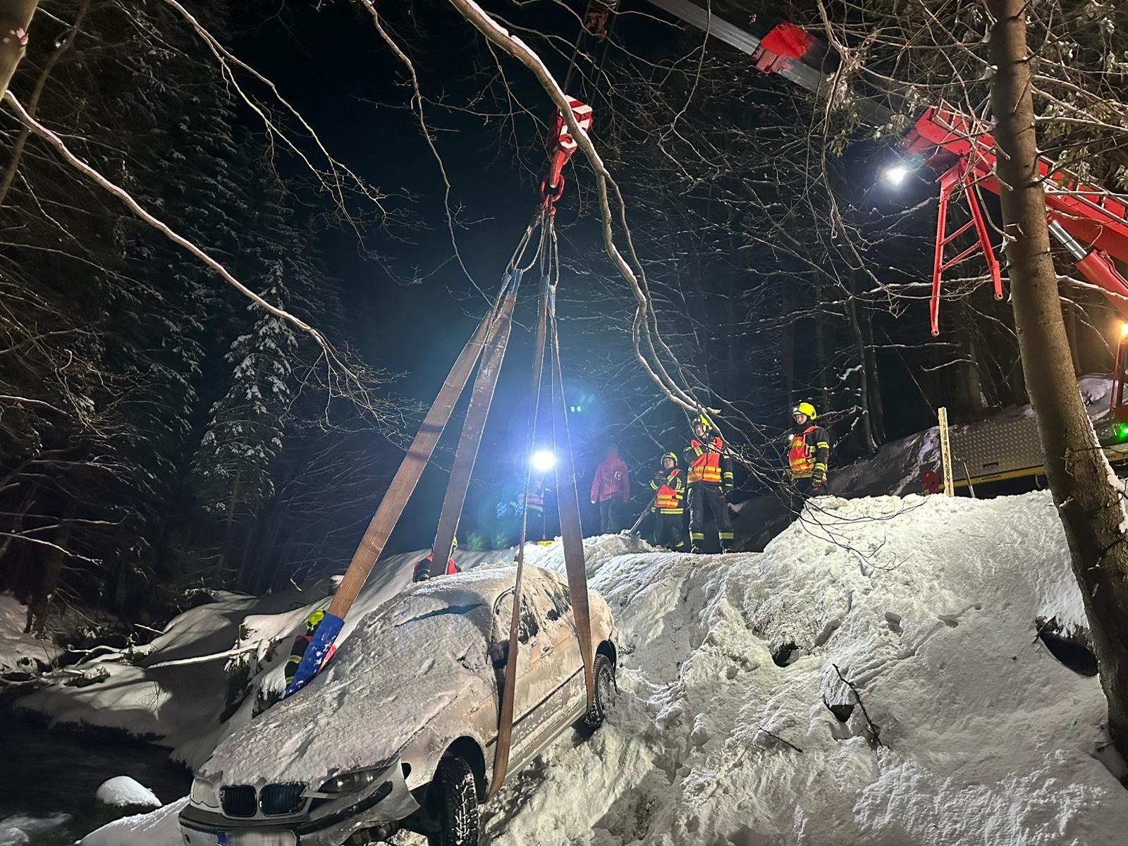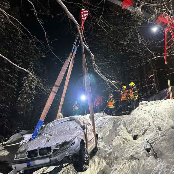 Za pomoci ramene jeřábu se jim podařilo havarované auto, které už bylo navíc zapadané sněhem, vyprostit z obtížně přístupného místa a dostat zpět na silnici. Celý zásah trval přibližně 45 minut a kolem půl desáté večer se jednotky vracely zpět na své základny.