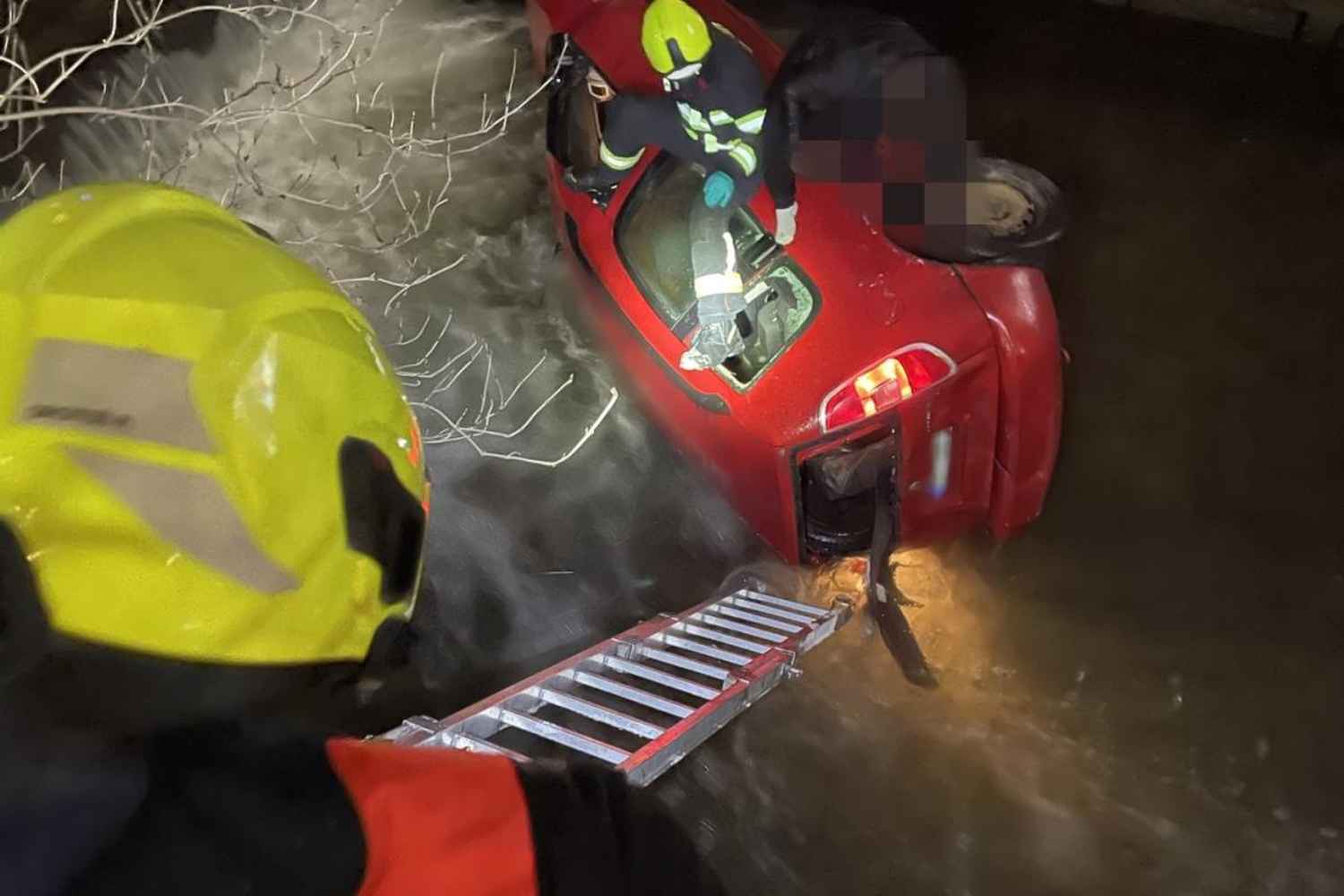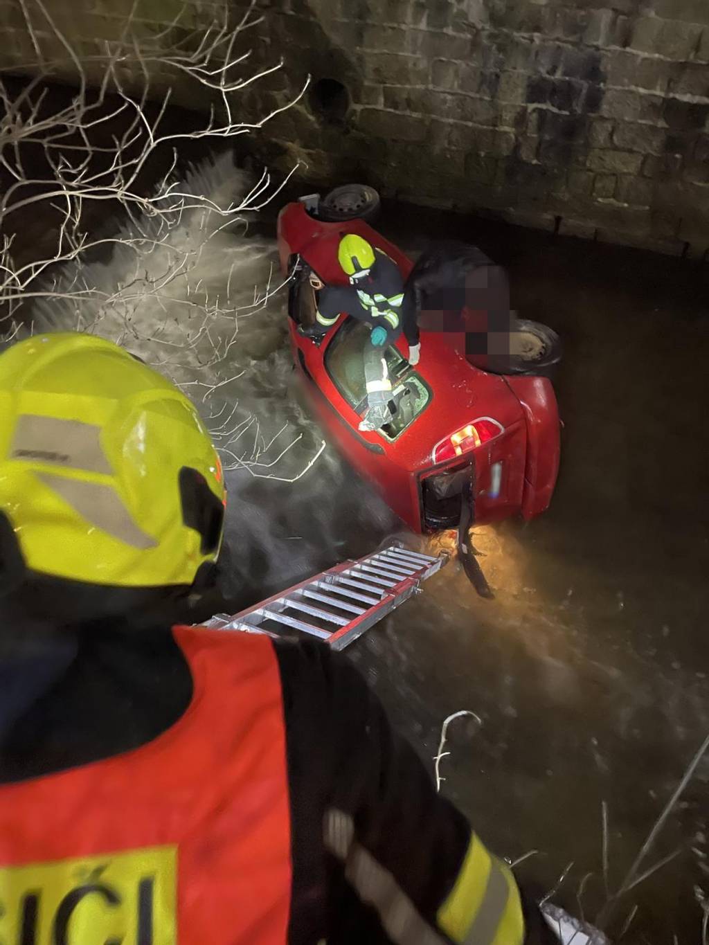 Hasiči při průzkumu zjistili, že vozidlo leží na boku a zraněný řidič se nachází mimo kabinu, zachycený na konstrukci auta nad korytem řeky. K jeho záchraně použili nastavovací žebřík, po kterém mu pomohli bezpečně dostat se z ledové Nisy.