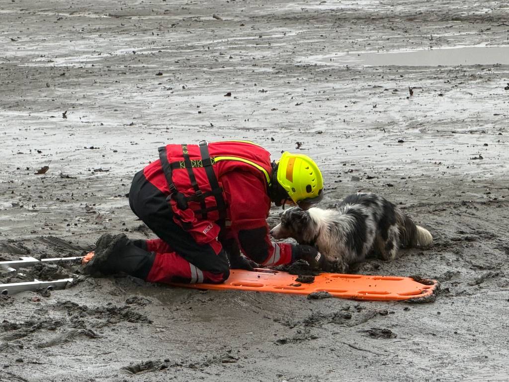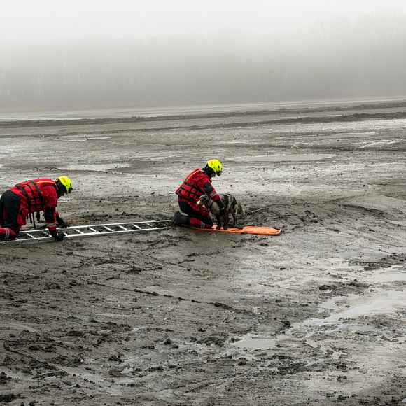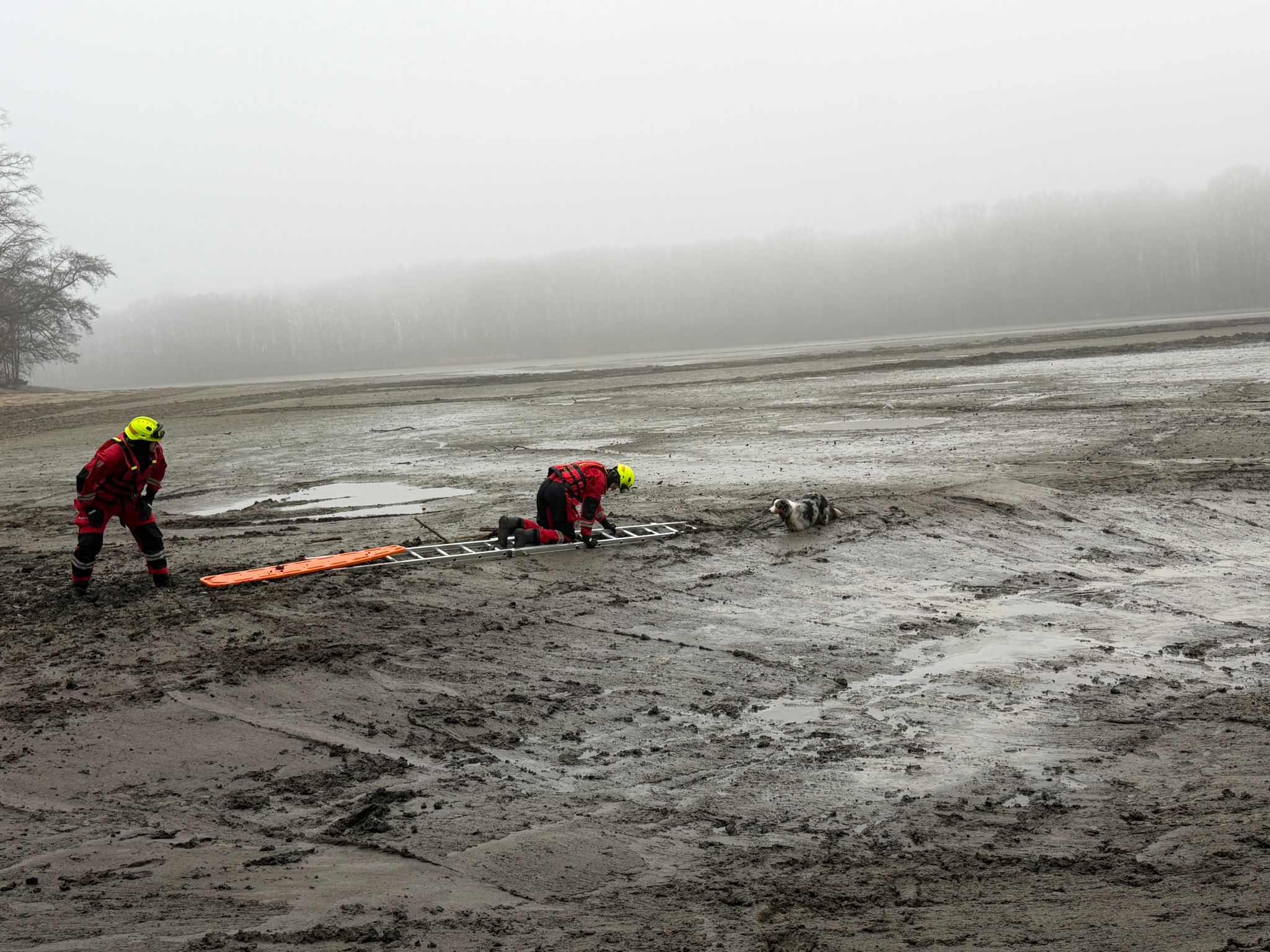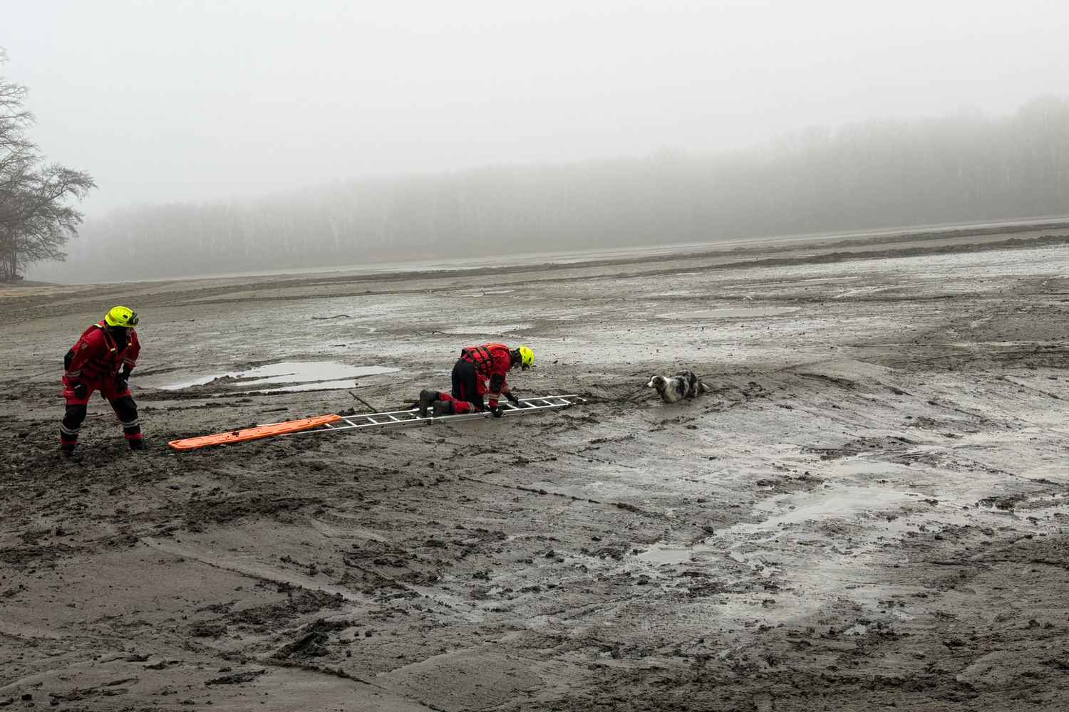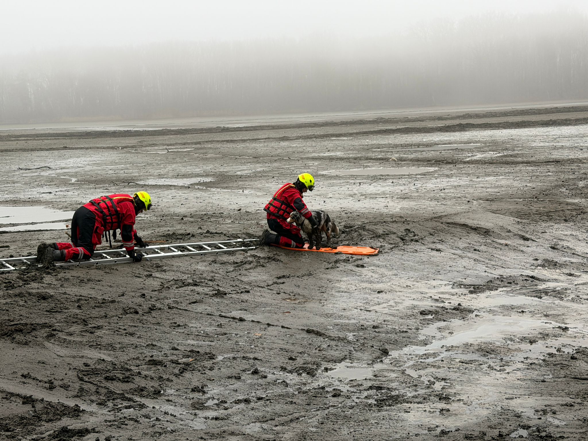 "V suchých oblecích jsme se vydali po rozbahněné ploše k uvězněnému psovi. Aby se minimalizovalo riziko dalšího boření, využili jsme nastavovací žebřík a desku, které jim umožnily bezpečný postup po nestabilním terénu," popsali hasiči.