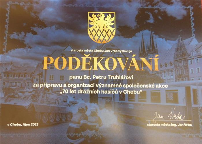 Výraznou stopu zanechal také v roce 2023, kdy inicioval a organizačně zajistil oslavy 70. výročí založení drážních hasičů v Chebu. Akce, která přilákala přes dva a půl tisíce návštěvníků, se setkala s velmi pozitivním ohlasem odborné i laické veřejnosti. Za její přípravu mu osobně poděkoval starosta města Cheb Jan Vrba.