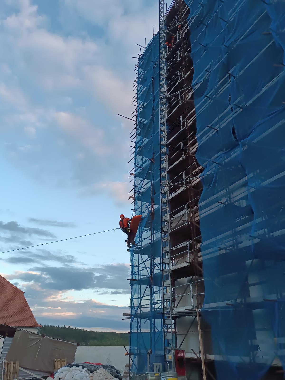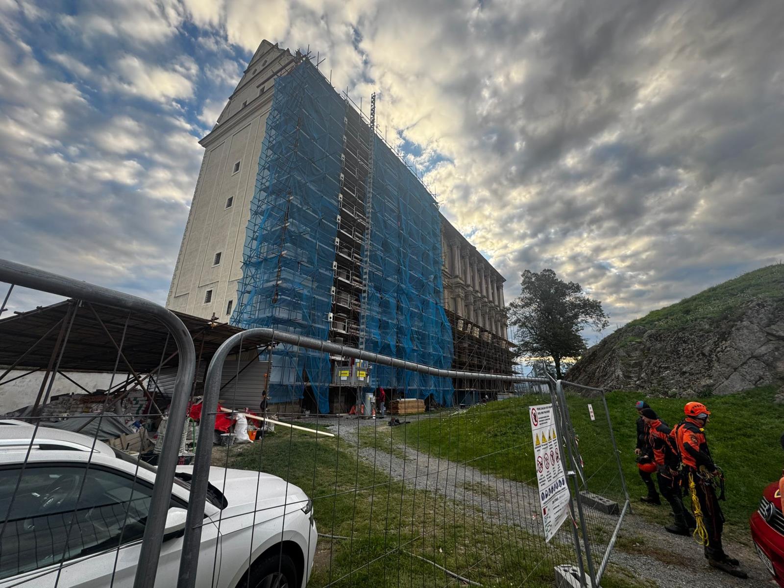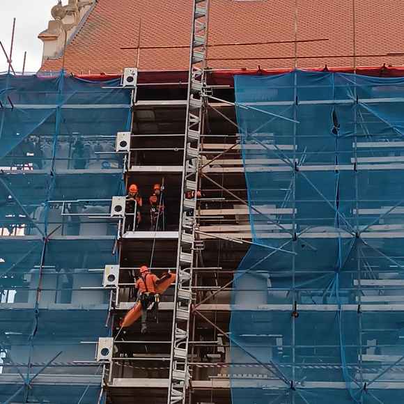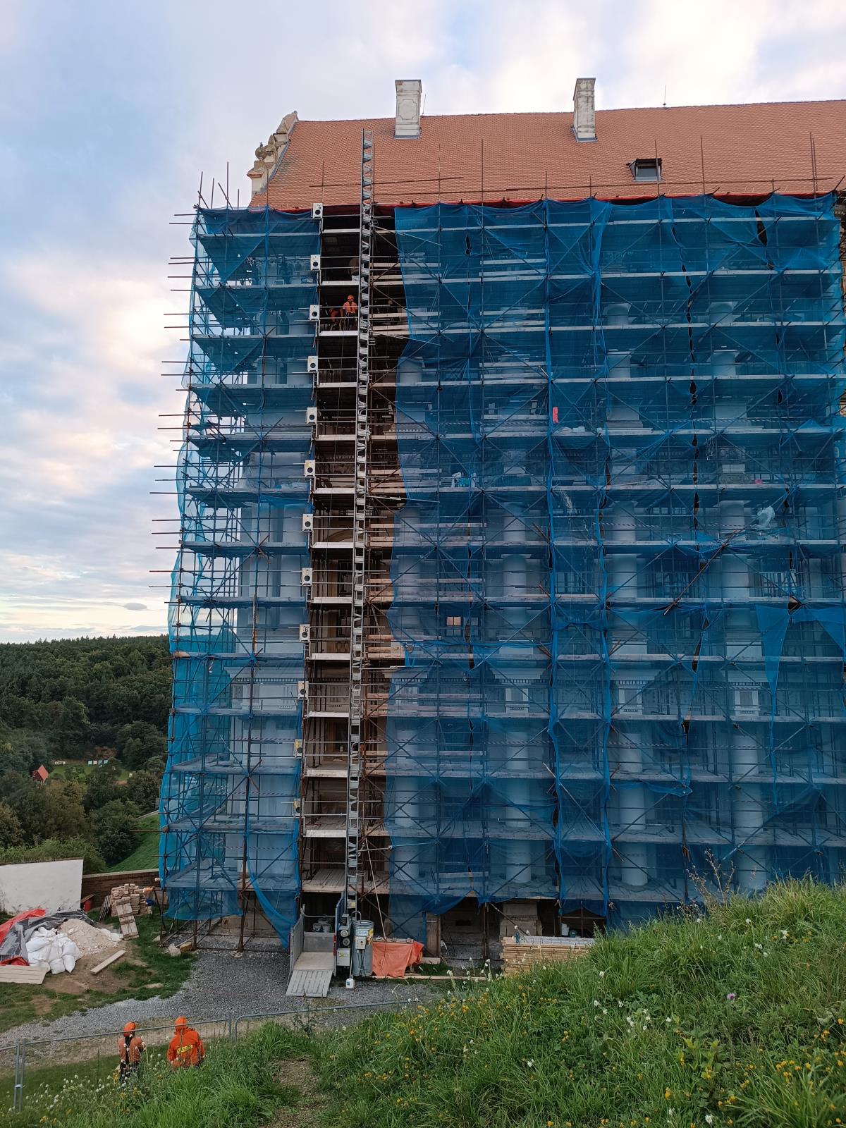 Zámek, lešení, koruny stromů, hasiči-lezci trénovali záchranu