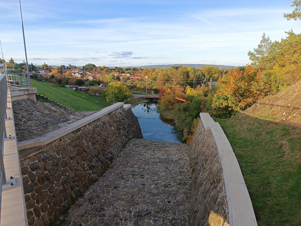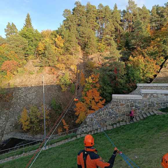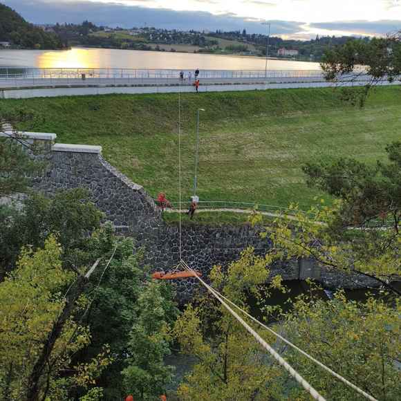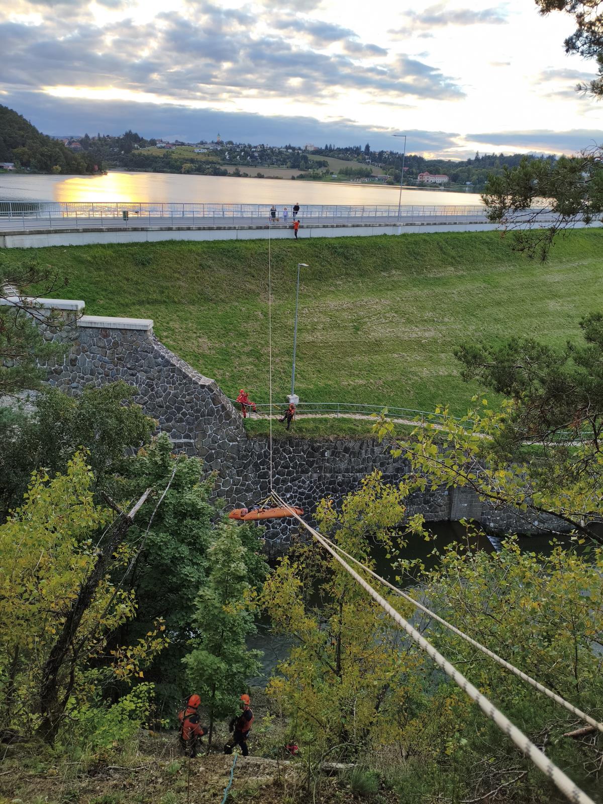 Další stanoviště čekalo u přepadu hráze vodní nádrže Plumlov. Tentokrát šlo o záchranu zraněného turistu za pomoc– techniky, která umožňuje bezpečný přesun osoby ve vodorovném směru mezi dvěma body.