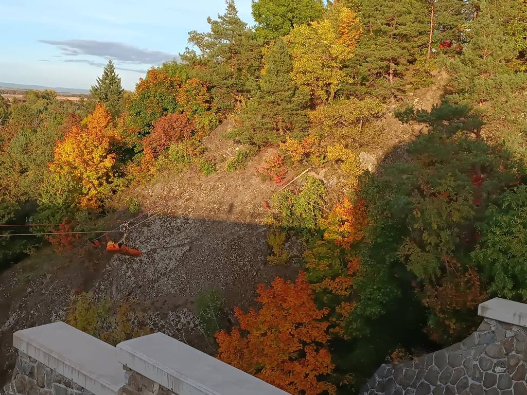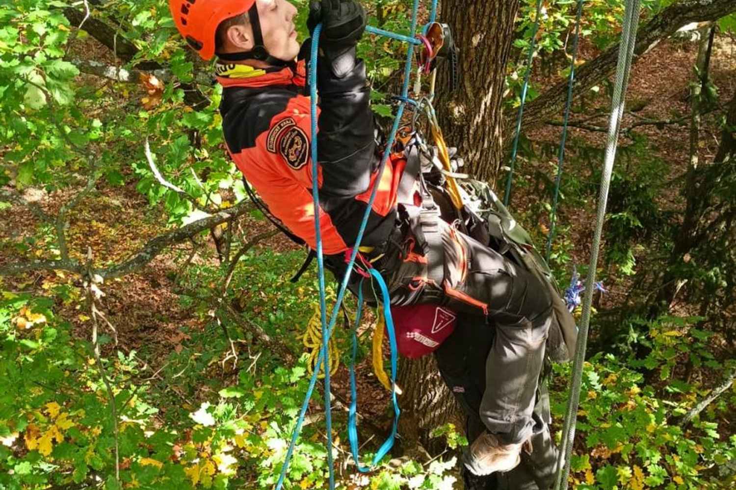 Hned několik modelových situací si hasiči vyzkoušeli v obci Křenůvky. Pomáhali zde například pořezanému arboristovi, paraglidistovi uvízlému vysoko ve větvích, nebo museli dostat zraněnou osobu z nepřístupného svahu do bezpečí.