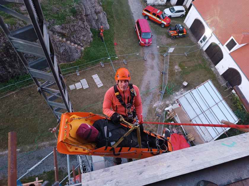 Pohádkové kulisy plumlovského zámku poskytly ideální prostor pro další lezecký úkol. Hasiči zde simulovali záchranu dělníka z lešení. Pomocí lanové techniky se jim podařilo dostat „zraněného“ bezpečně na zem.