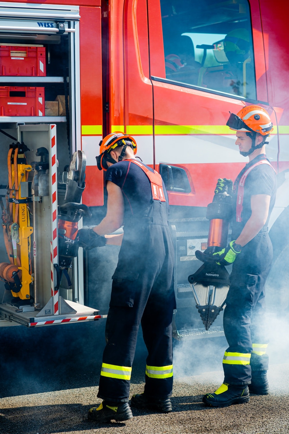 Samotné focení probíhalo celkem poklidně, ve veselé atmosféře, jen hasiči byli nervózní, protože to pro většinu byla první akce tohoto typu (focení "ve službě"). Hasiče jsem dopředu informoval, jaký mám záměr fotit, co by mělo být na fotkách, ale jen v hrubé kostře. Chtěl jsme zachytit hasiče při různých profesí (strojník, pilot dronu, velitel zásahu ...), já bohužel neznám přesné postupy, výzbroj a podobně, to si už museli chlapi nachystat sami. Naštěstí byli velmi nápomocni a šlo to lehce. Dokonce i vymýšleli scénáře sami. Za což jim moc děkuji :) Nejvíc se mi líbil jejich nápad na fotku, která pak celý kalendář uzavírá. Kdy s generátorem kouře zakourili celou jednu garáž, a pak vycházejí z otevřené rolety v dýchacích přístrojích.