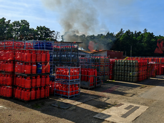 Požár haly 50x10m s PB lahvemi ve firmě Tomegas Branice