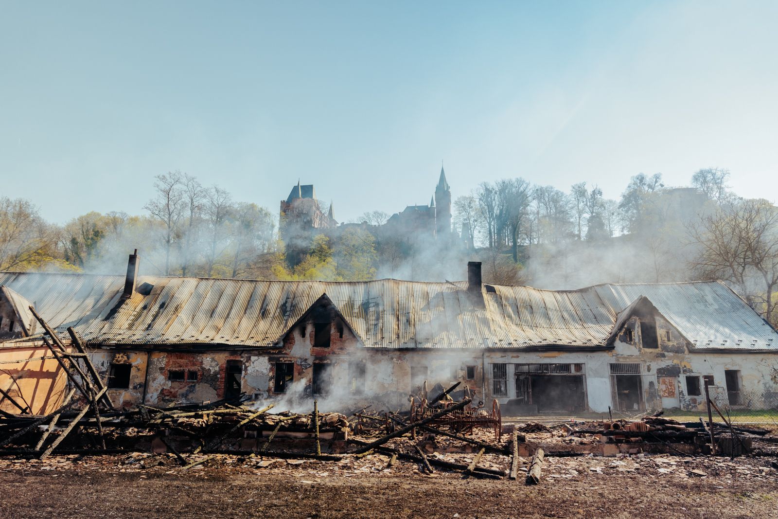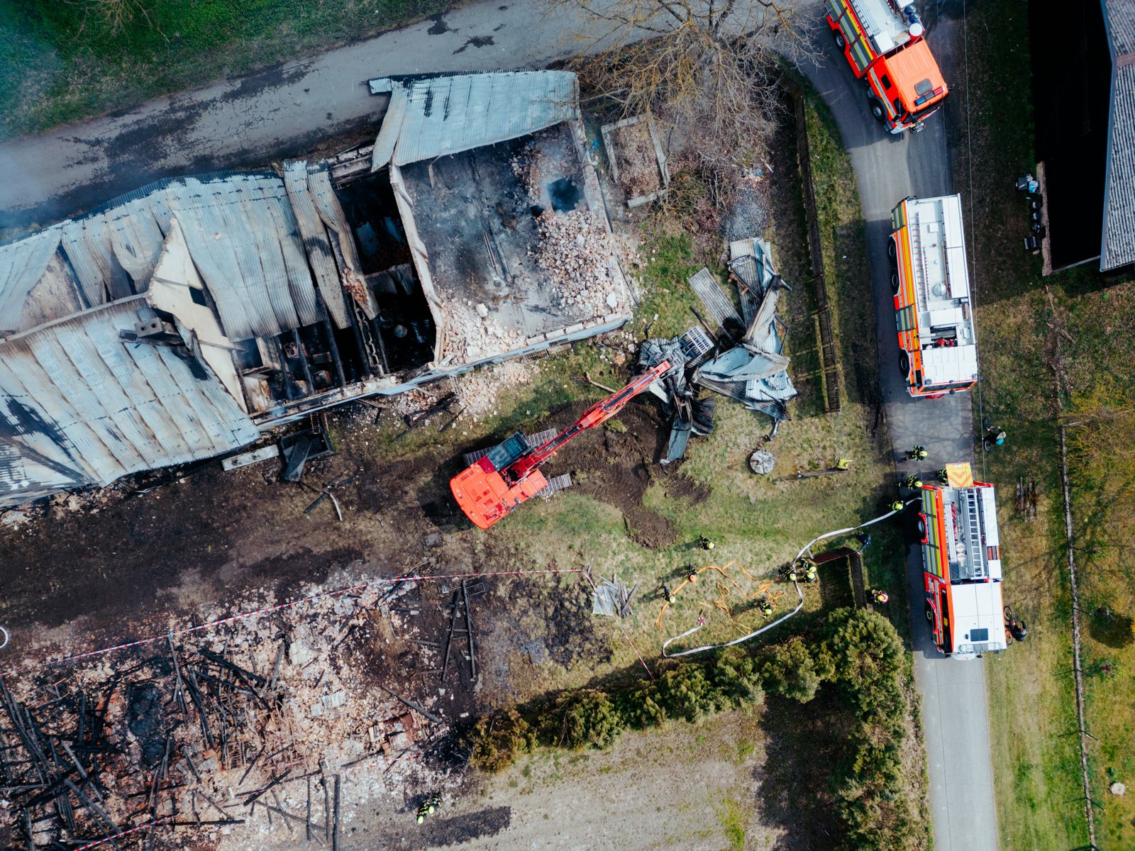 Po příjezdu prvních jednotek bylo zřejmé, že hospodářská budova o rozměrech přibližně 15 × 10 metrů je požárem zasažena v celém rozsahu. Oheň se navíc rozšířil i na střechu sousední budovy. Hasiči nasadili šest vodních proudů a kvůli zajištění dostatku vody zřídili čerpání ze dvou odběrných míst na řece Moravici.