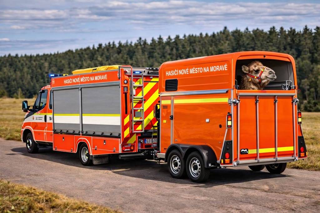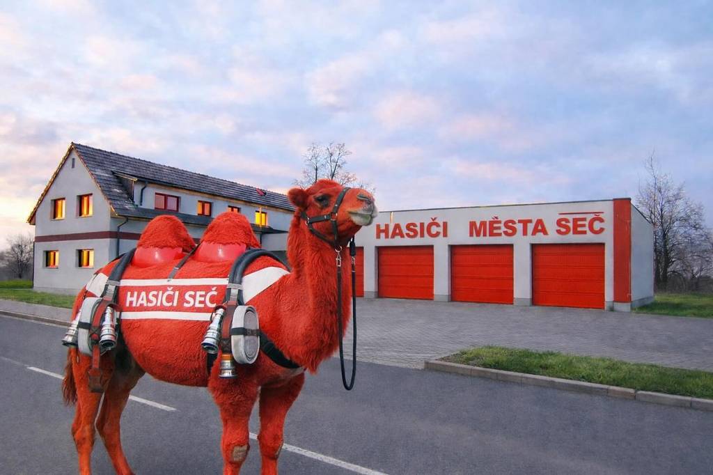 Naše jednotka dnes slavnostně představila nového člena týmu. Po několikaměsíčním testování a náročném výcviku jsme do služby zařadili speciálně vycvičeného hasičského velblouda, který bude pomáhat při dopravě hadic a vybavení do těžko přístupného terénu. Velbloud se osvědčil především při požárech lesních porostů, při zásazích v kopcovitém terénu a také při transportech zraněných osob z těžko přístupného terénu. Díky své vytrvalosti unese bez problémů několik hadic a spoustu další výbavy a dopraví je tam, kam se těžká technika nedostane. Nesmírnou výhodu je také jeho schopnost tvrdě pracovat několik hodin bez vody. Pro přepravu byl pořízen speciální přívěs, který bude tahat náš technický automobil Iveco.