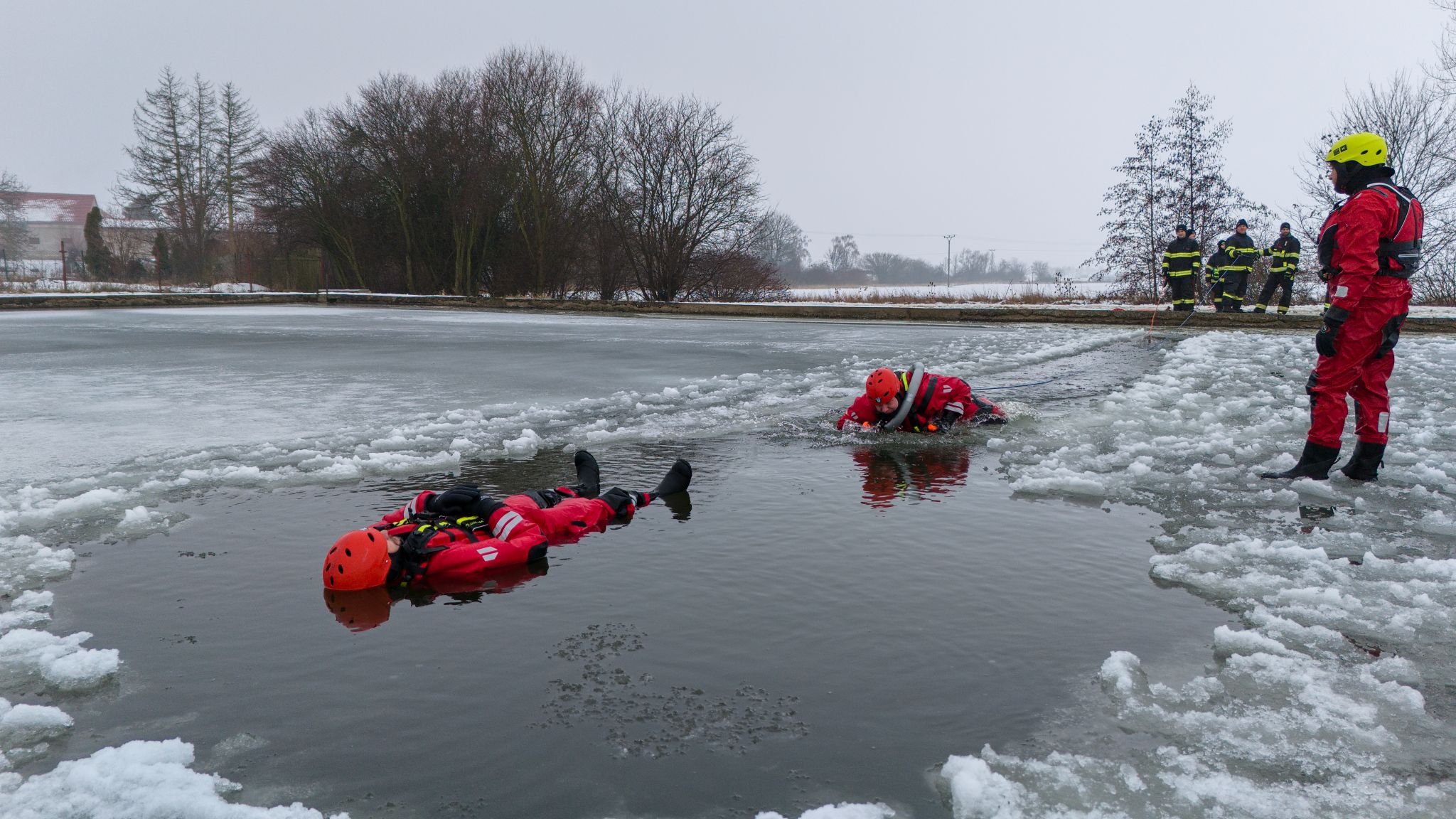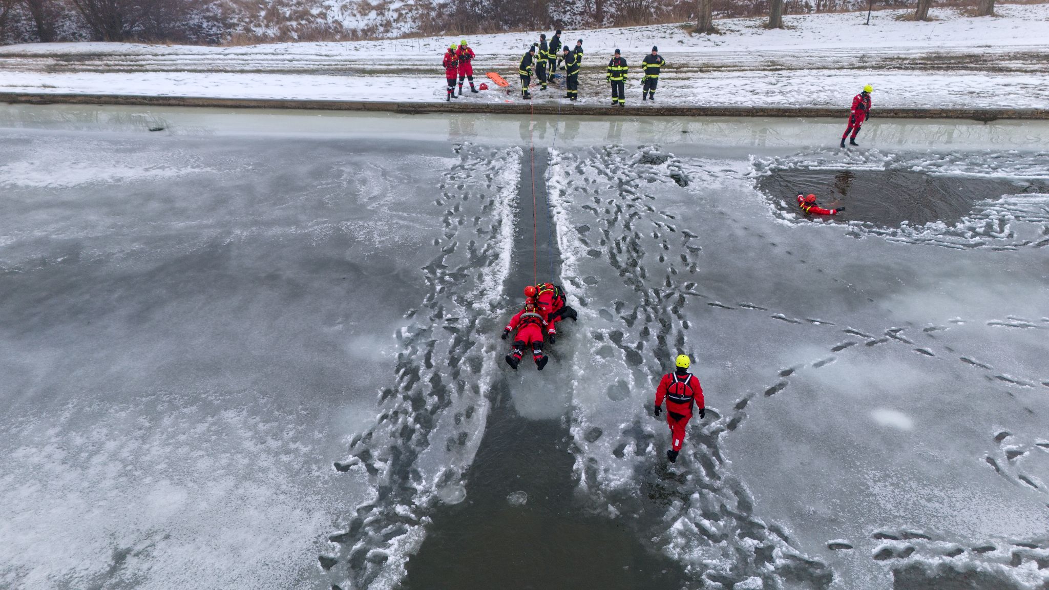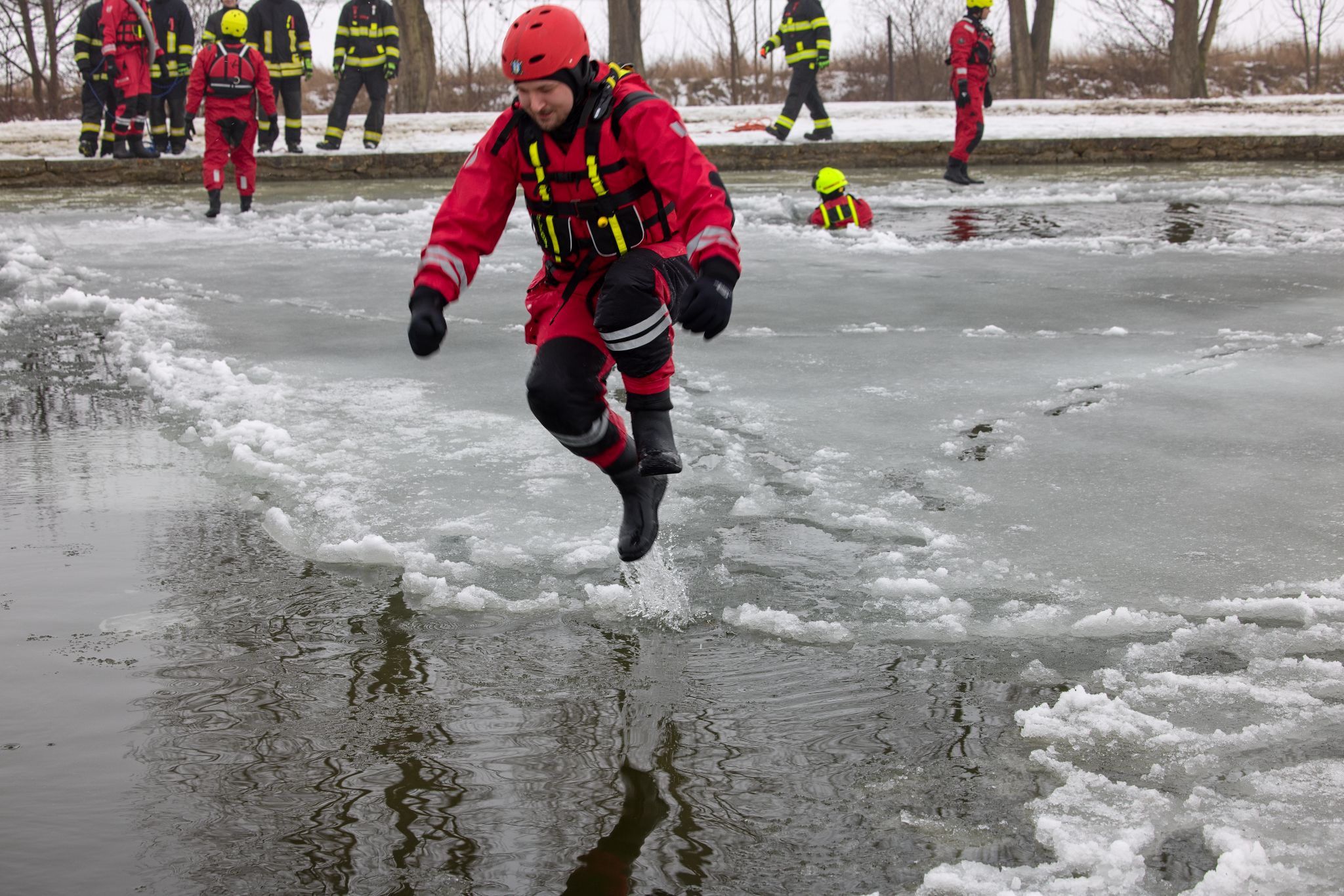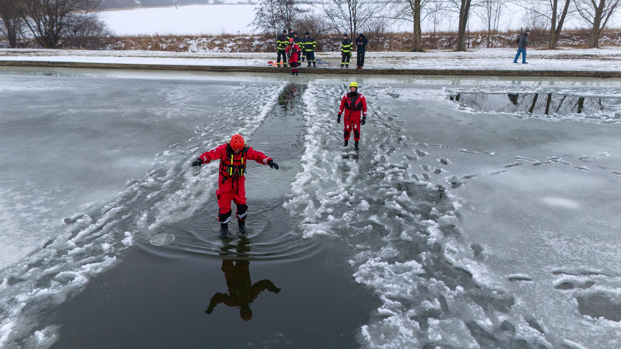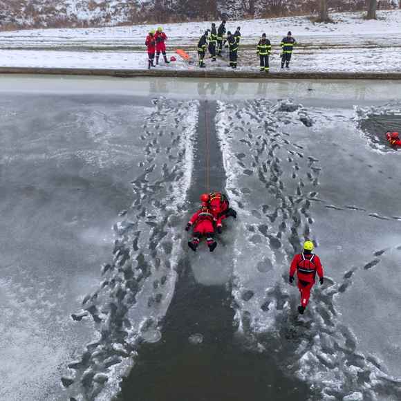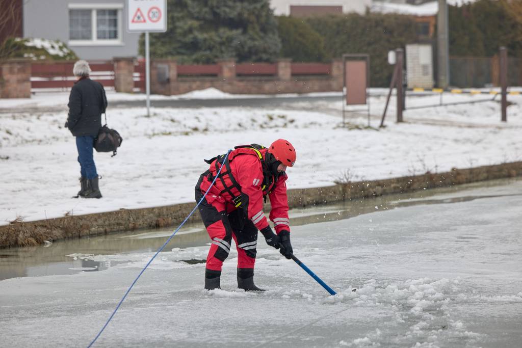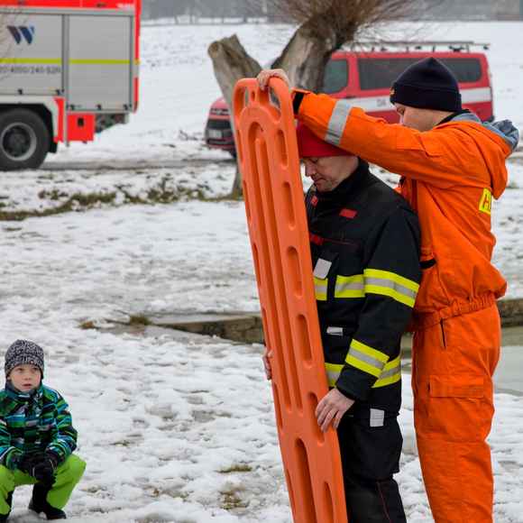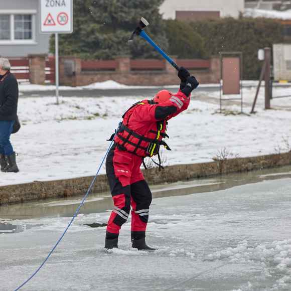 Po úvodu následovala praktická část. Hasiči si vysekali a vyřezali několik otvorů do ledu a rozdělili se do dvou skupin. Vzhledem k tomu, že led byl na řadě míst stále poměrně pevný, šla jedna z tras „za záchranou“ přes další otvor – aby se nasimulovalo druhé propadnutí a jednotky si vyzkoušely, jak rychle se situace může zkomplikovat.