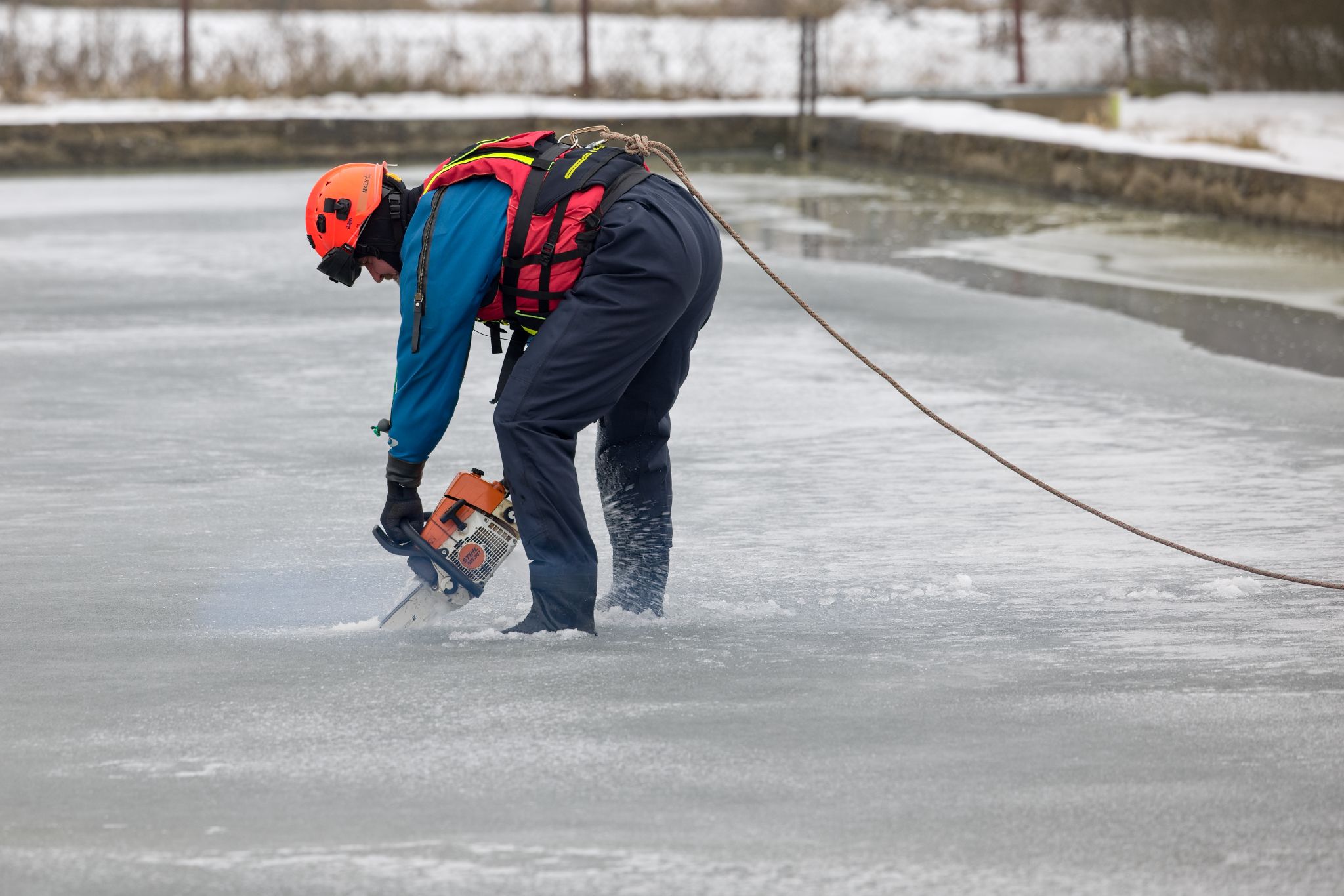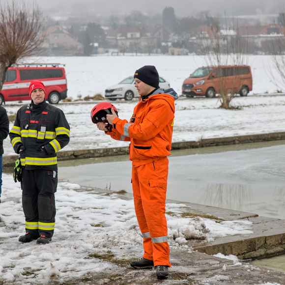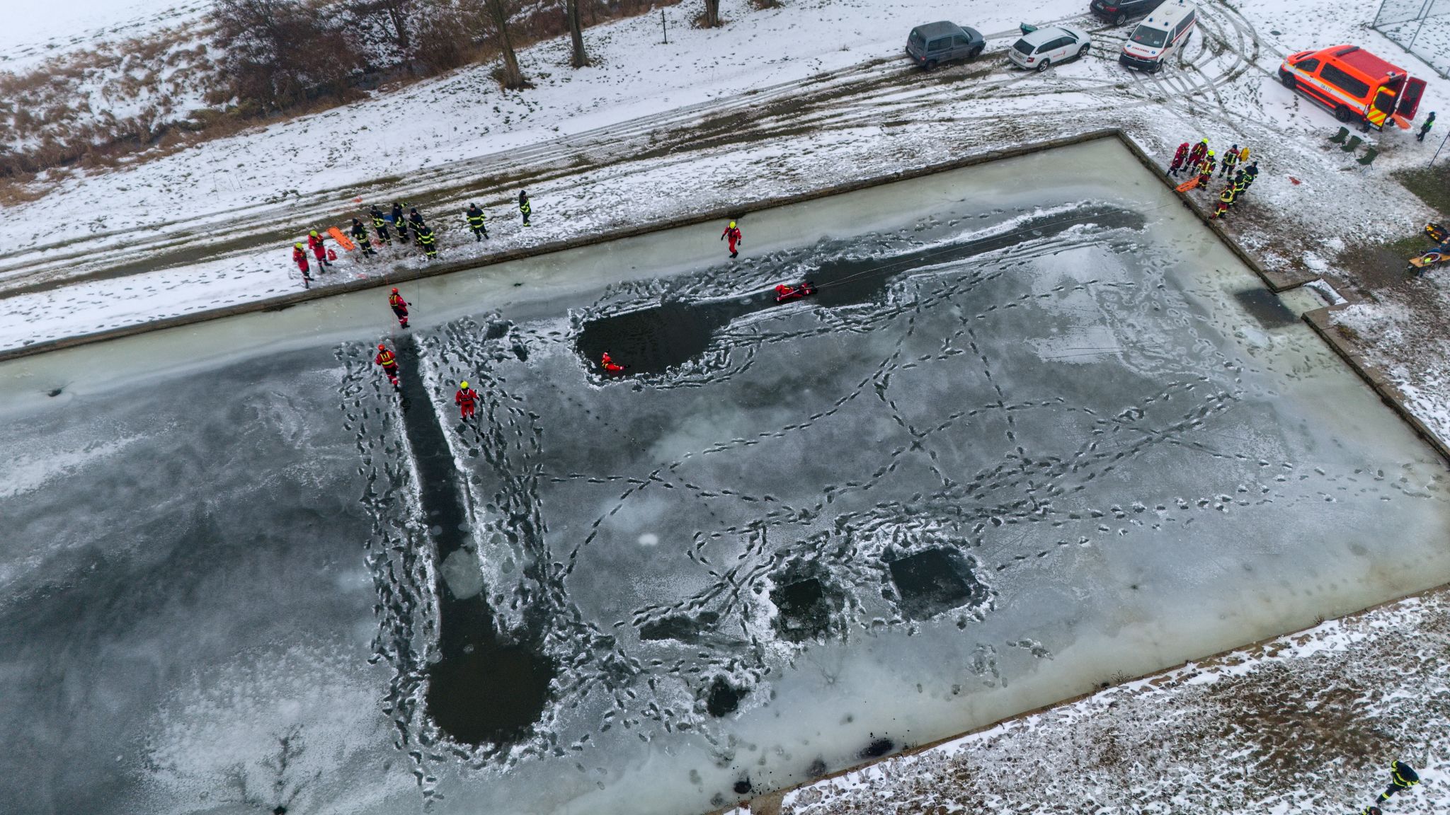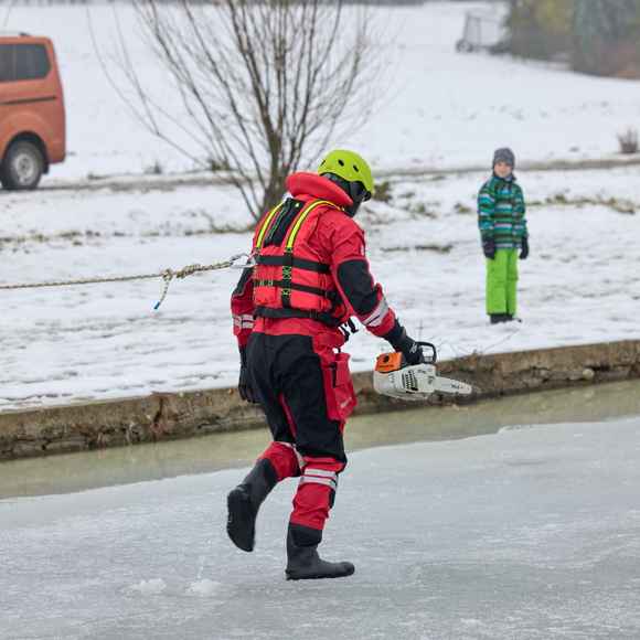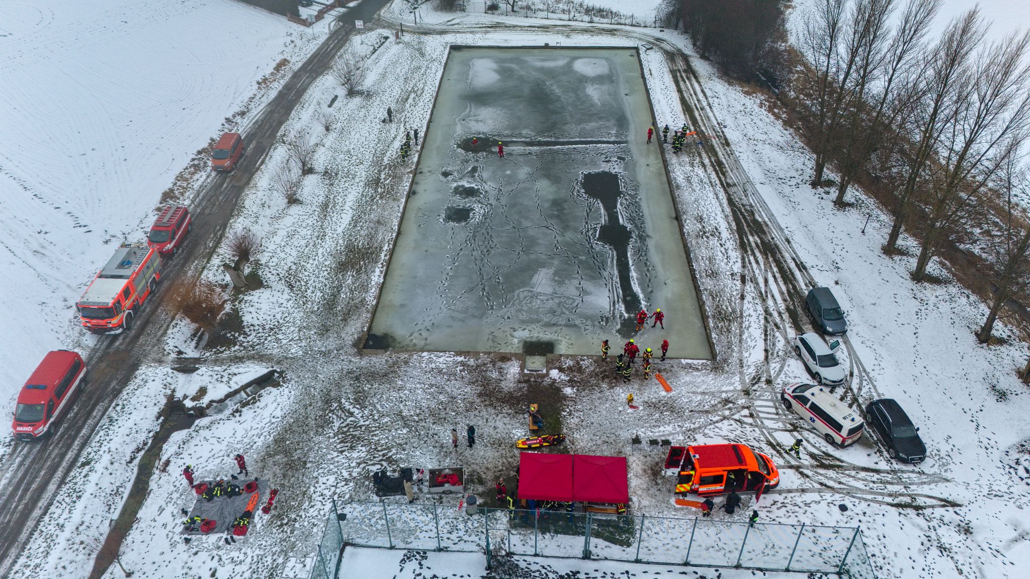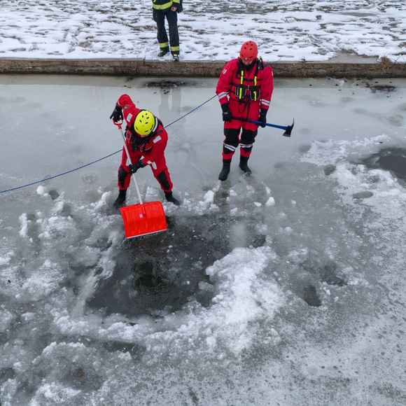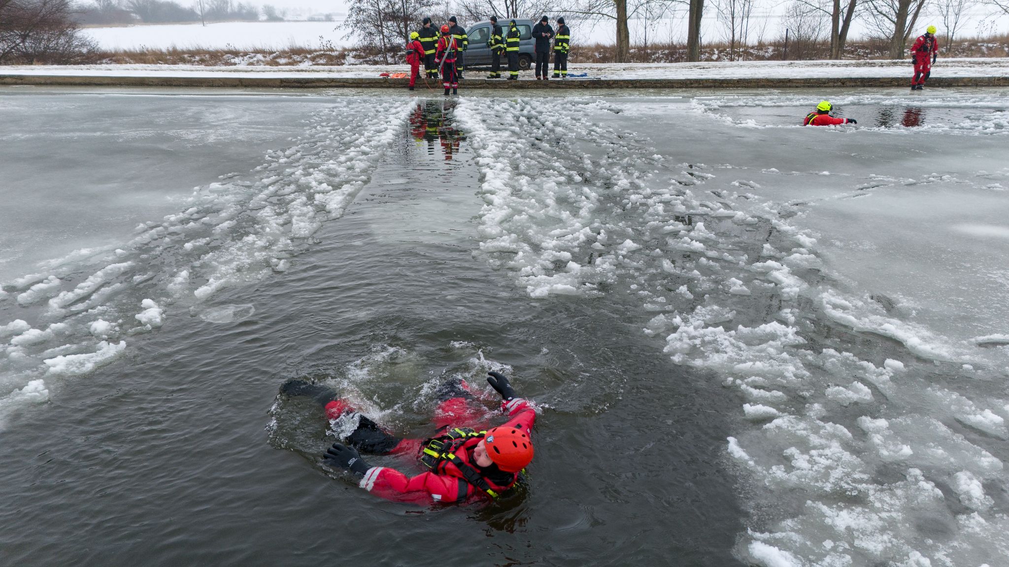 Po úvodu následovala praktická část. Hasiči si vysekali a vyřezali několik otvorů do ledu a rozdělili se do dvou skupin. Vzhledem k tomu, že led byl na řadě míst stále poměrně pevný, šla jedna z tras „za záchranou“ přes další otvor – aby se nasimulovalo druhé propadnutí a jednotky si vyzkoušely, jak rychle se situace může zkomplikovat.