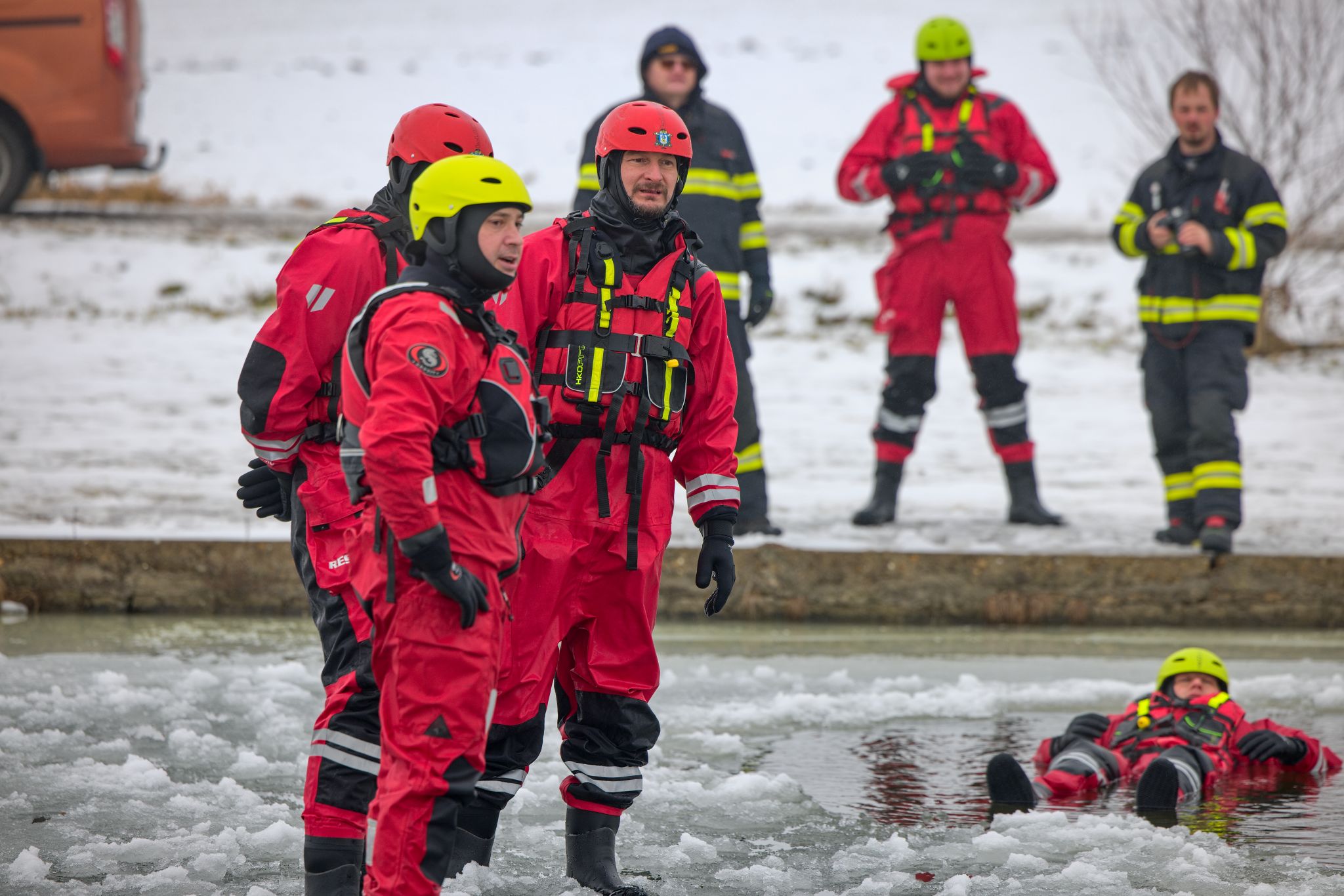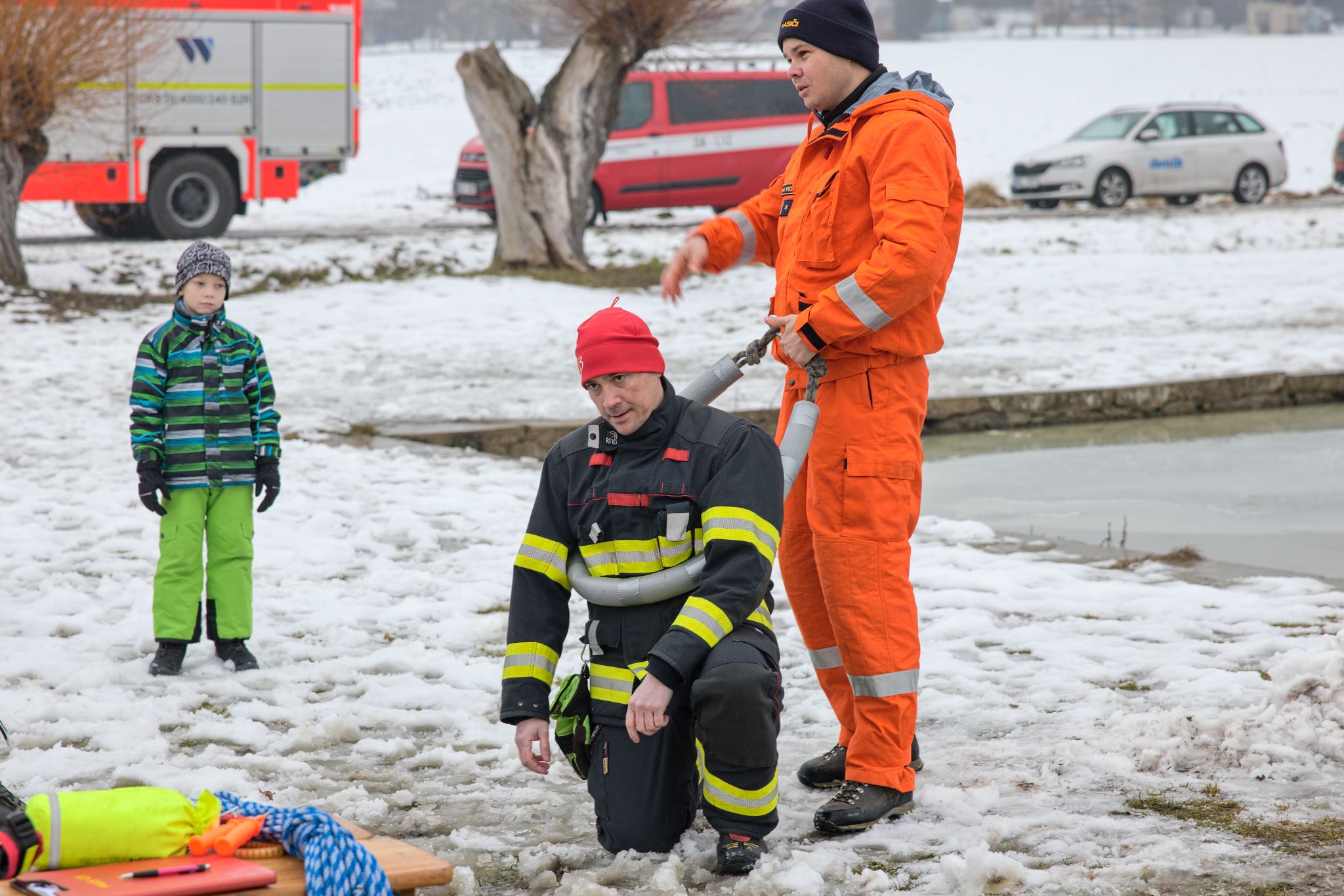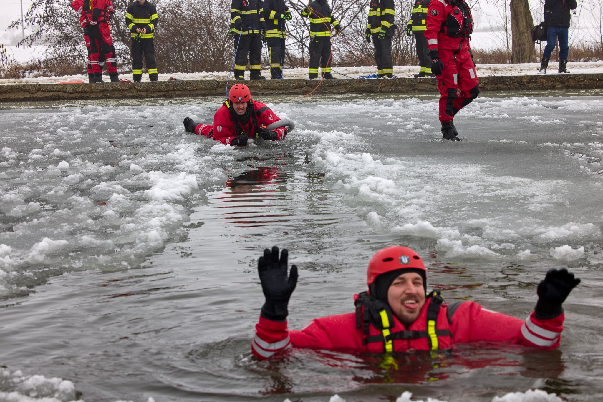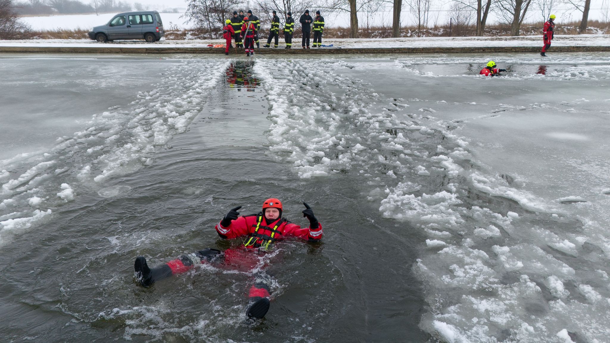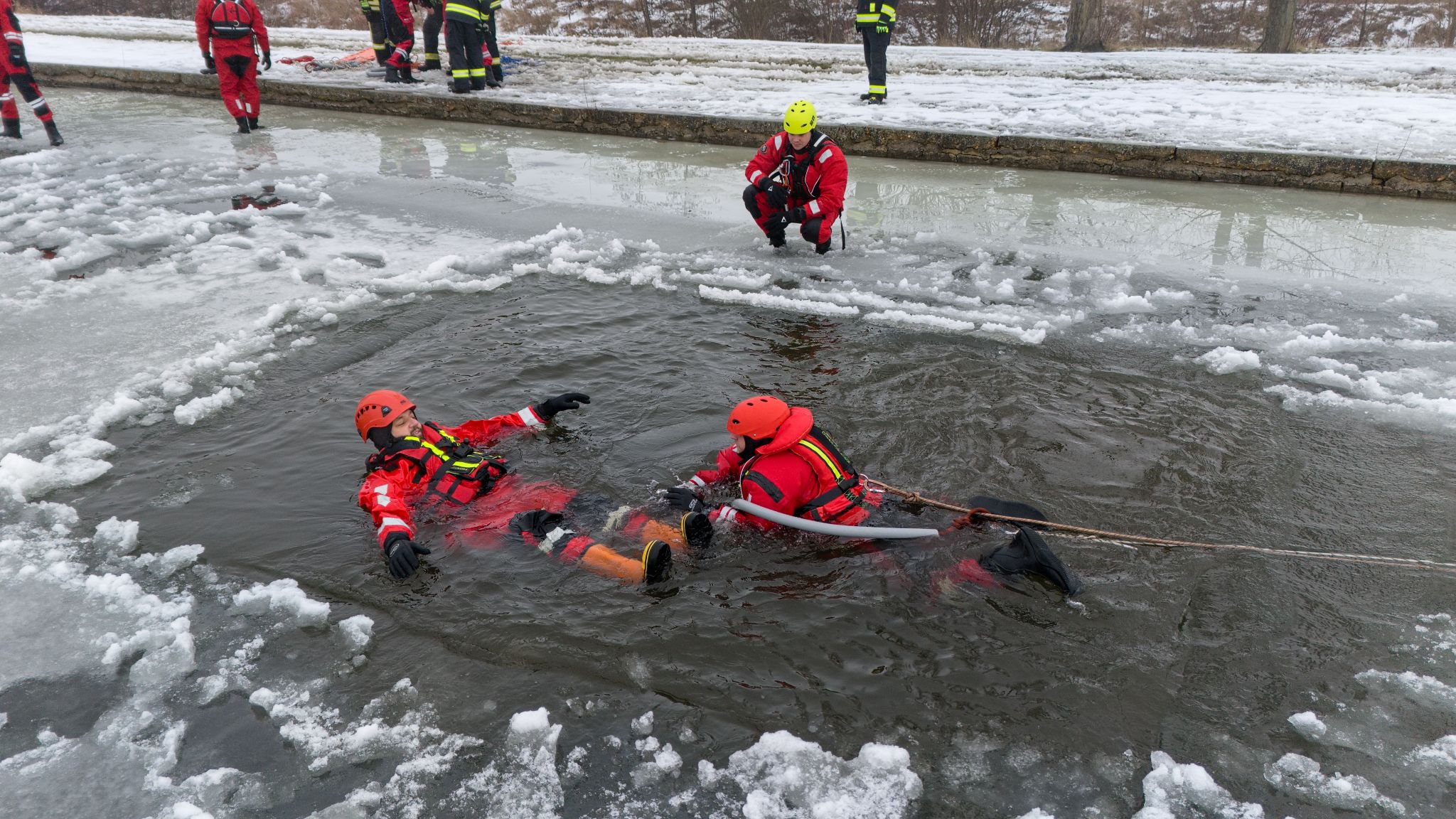 Po úvodu následovala praktická část. Hasiči si vysekali a vyřezali několik otvorů do ledu a rozdělili se do dvou skupin. Vzhledem k tomu, že led byl na řadě míst stále poměrně pevný, šla jedna z tras „za záchranou“ přes další otvor – aby se nasimulovalo druhé propadnutí a jednotky si vyzkoušely, jak rychle se situace může zkomplikovat.