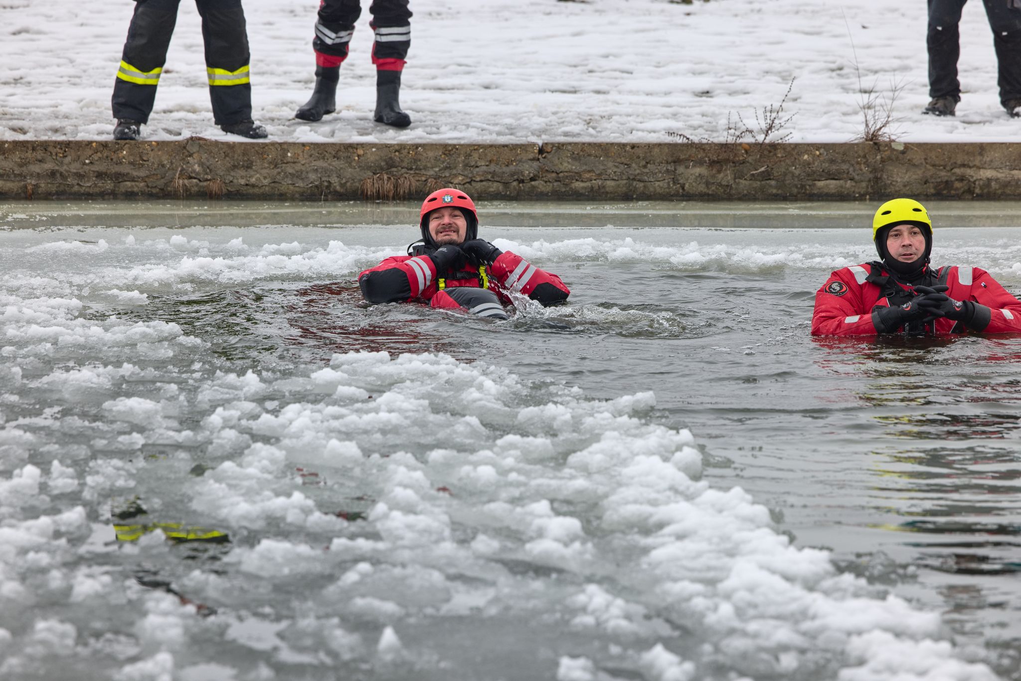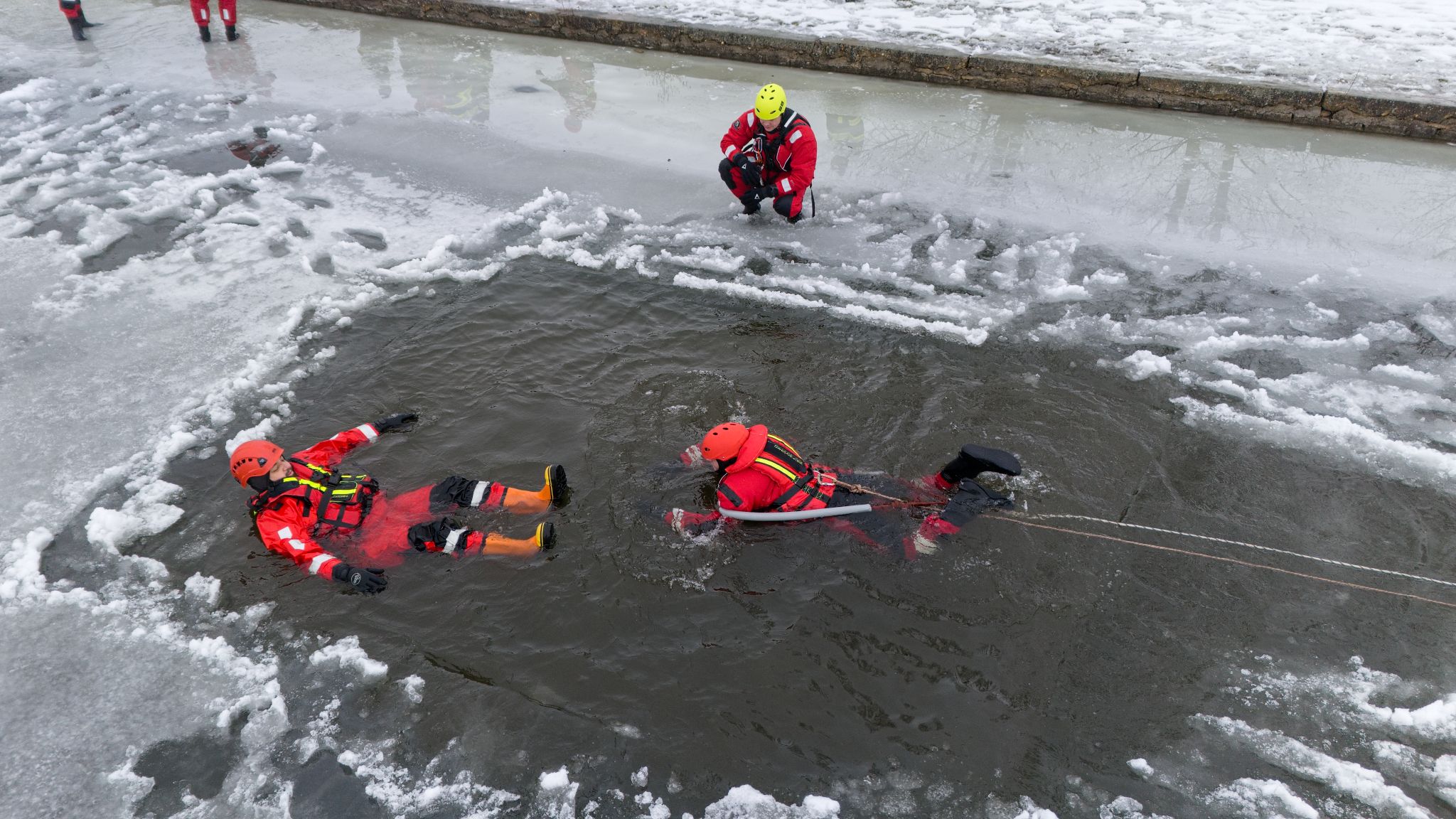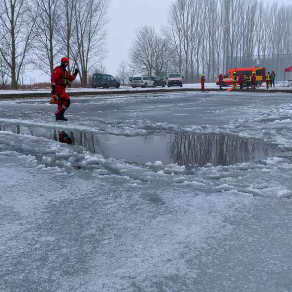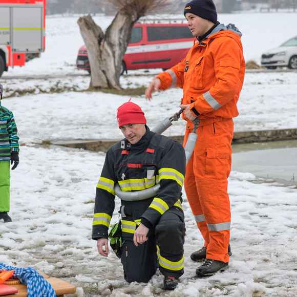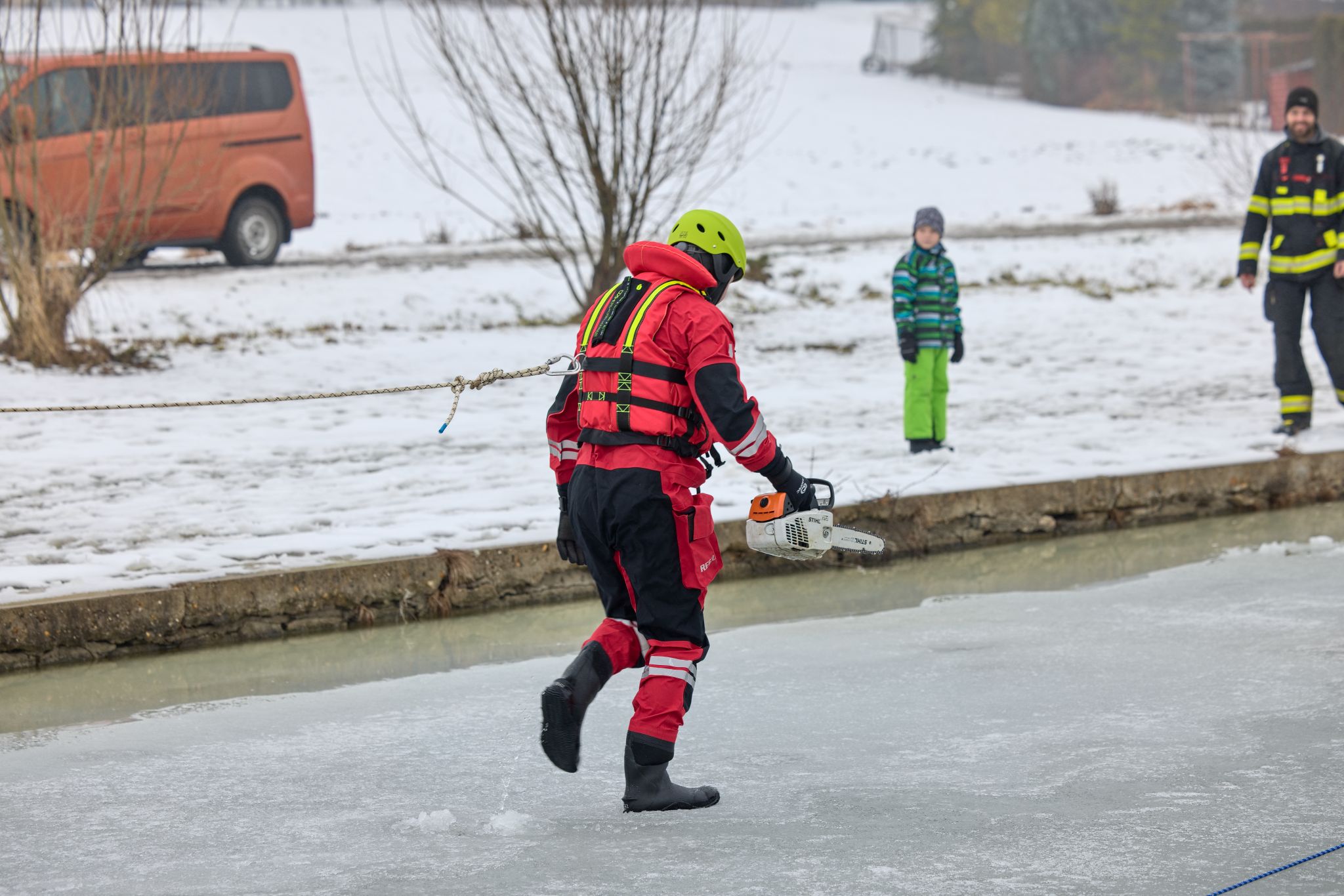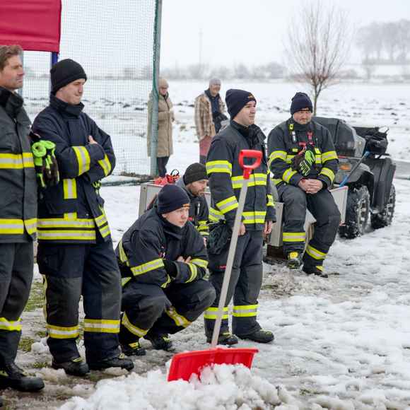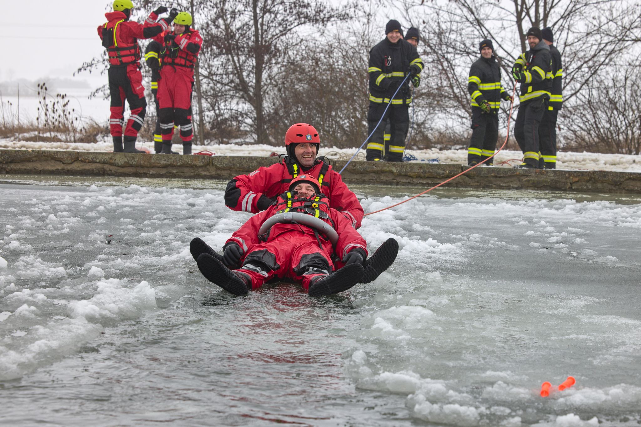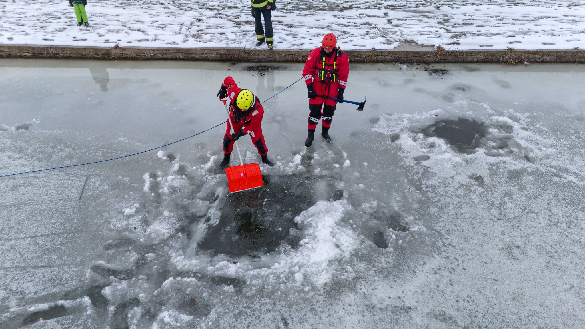 Po úvodu následovala praktická část. Hasiči si vysekali a vyřezali několik otvorů do ledu a rozdělili se do dvou skupin. Vzhledem k tomu, že led byl na řadě míst stále poměrně pevný, šla jedna z tras „za záchranou“ přes další otvor – aby se nasimulovalo druhé propadnutí a jednotky si vyzkoušely, jak rychle se situace může zkomplikovat.