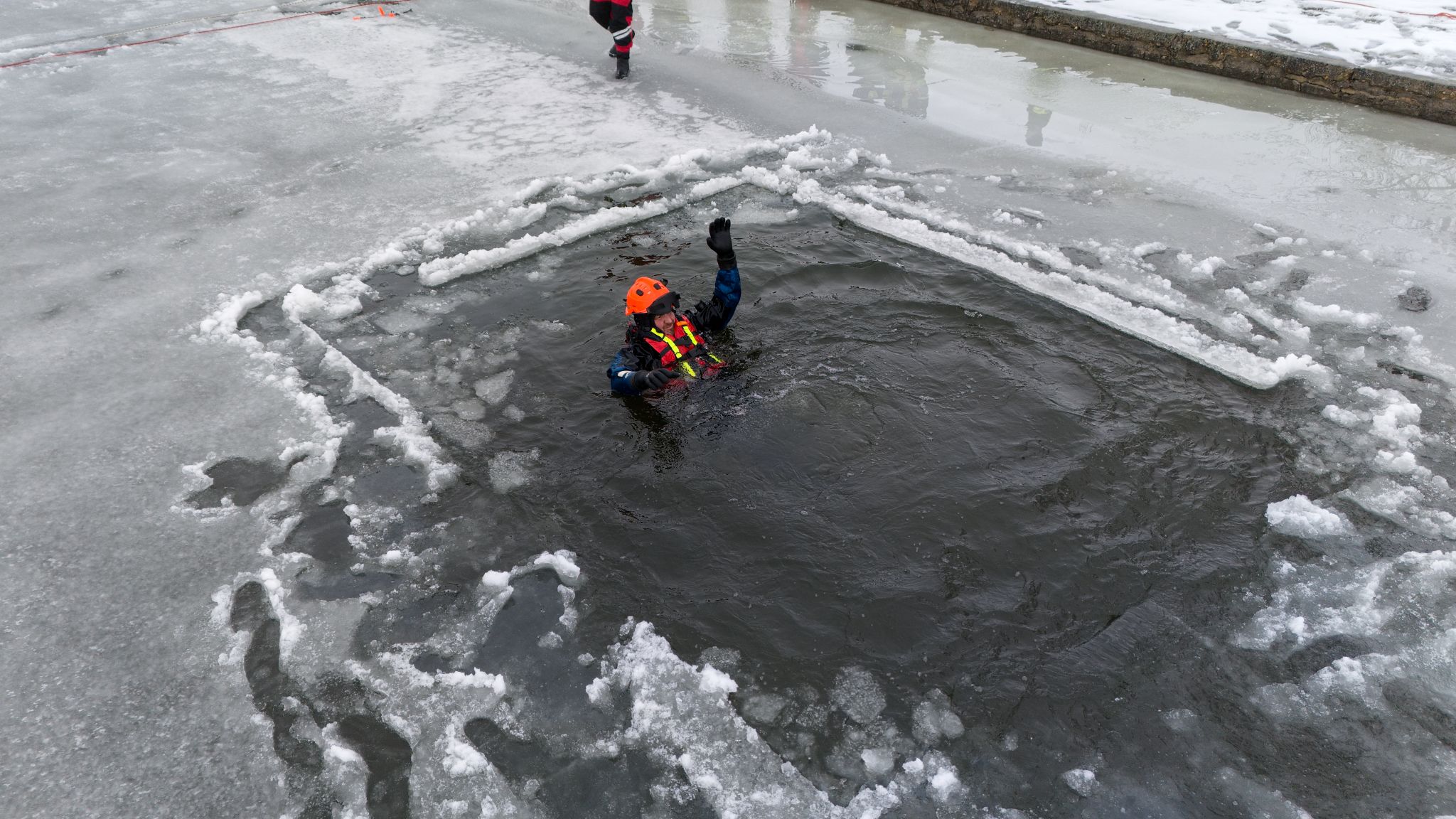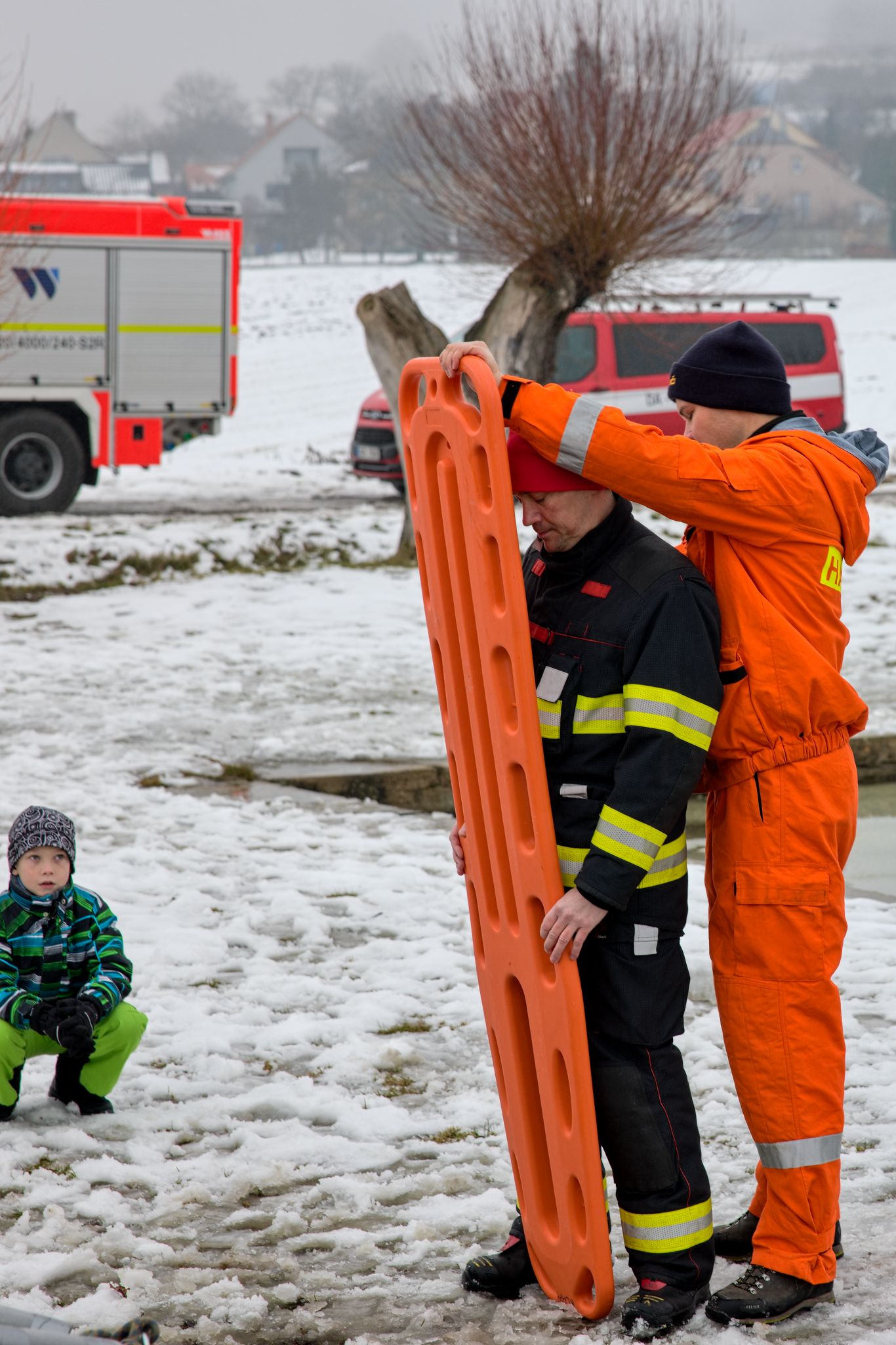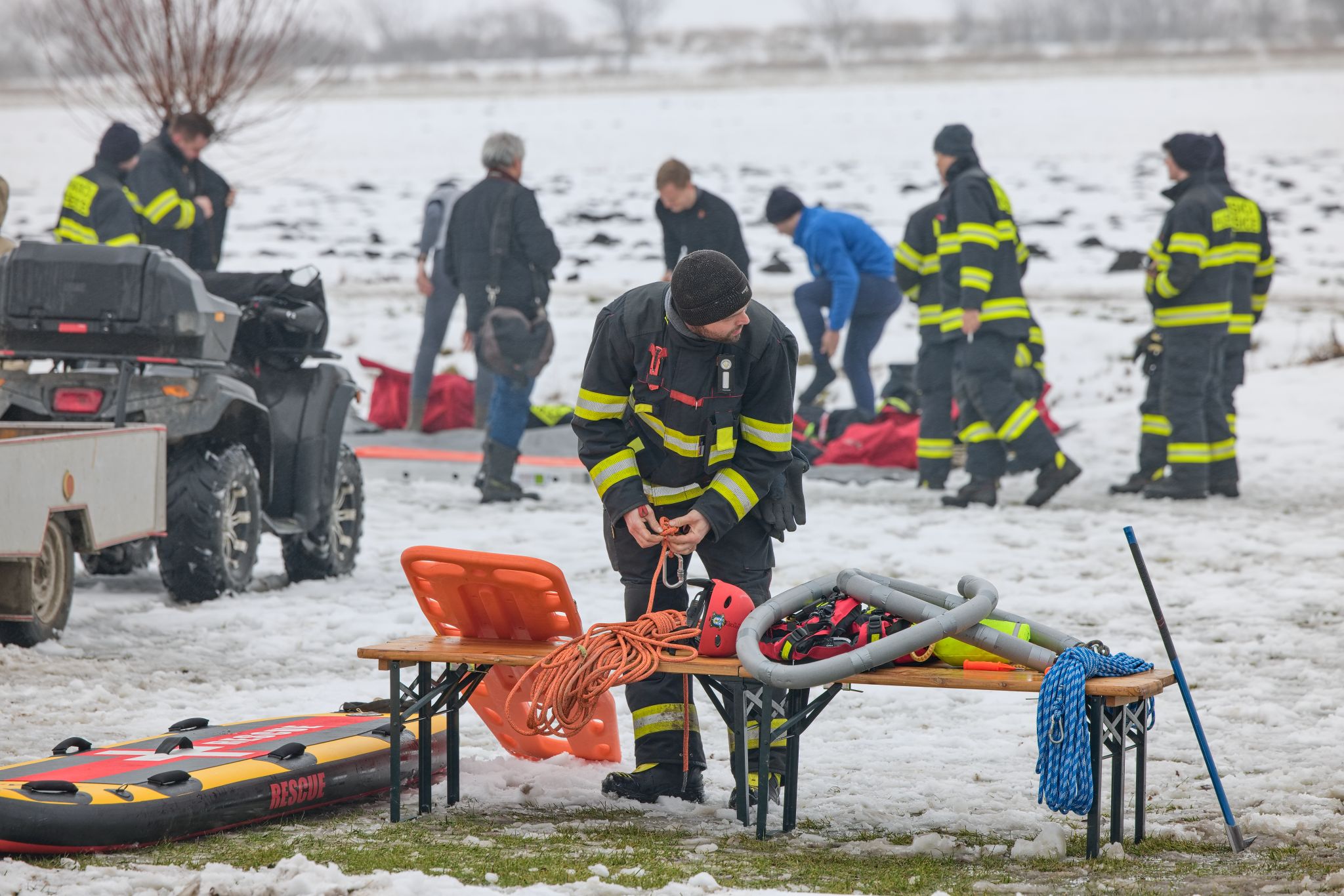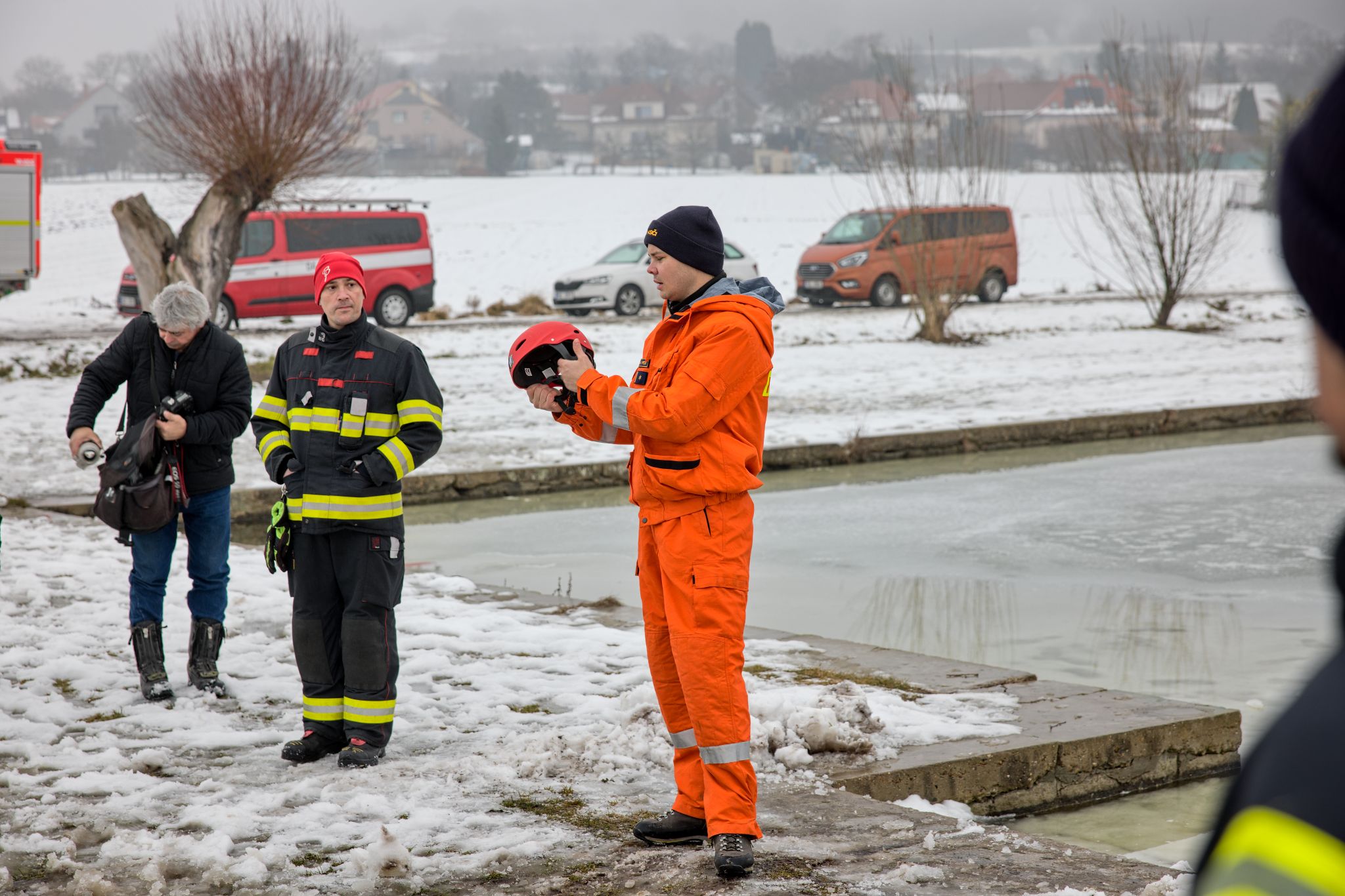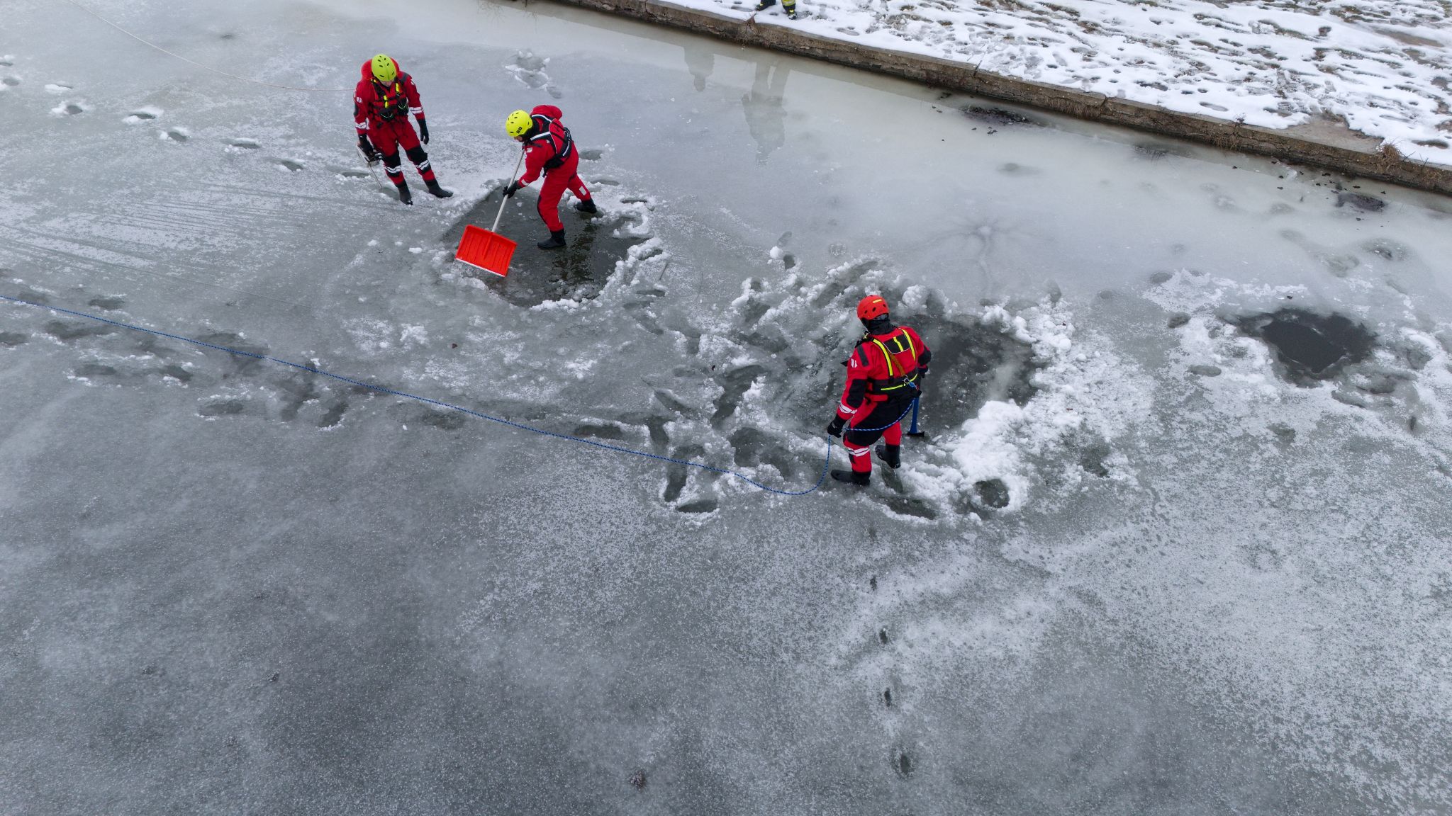 Po úvodu následovala praktická část. Hasiči si vysekali a vyřezali několik otvorů do ledu a rozdělili se do dvou skupin. Vzhledem k tomu, že led byl na řadě míst stále poměrně pevný, šla jedna z tras „za záchranou“ přes další otvor – aby se nasimulovalo druhé propadnutí a jednotky si vyzkoušely, jak rychle se situace může zkomplikovat.