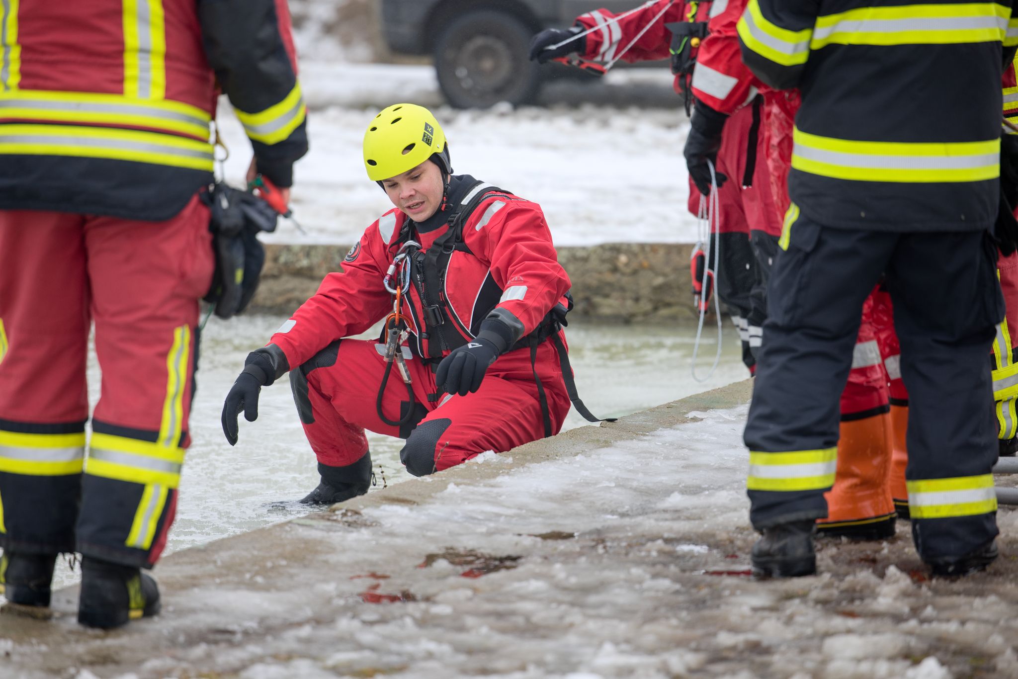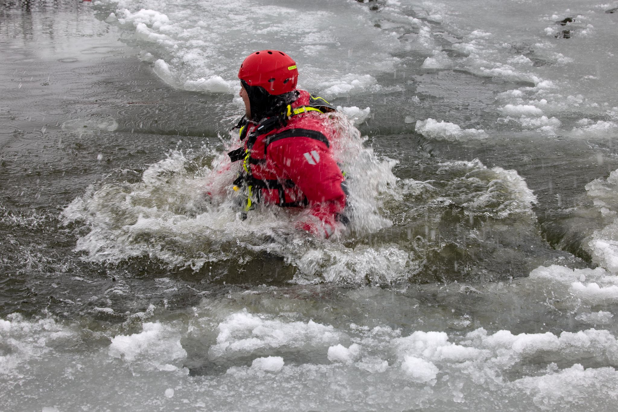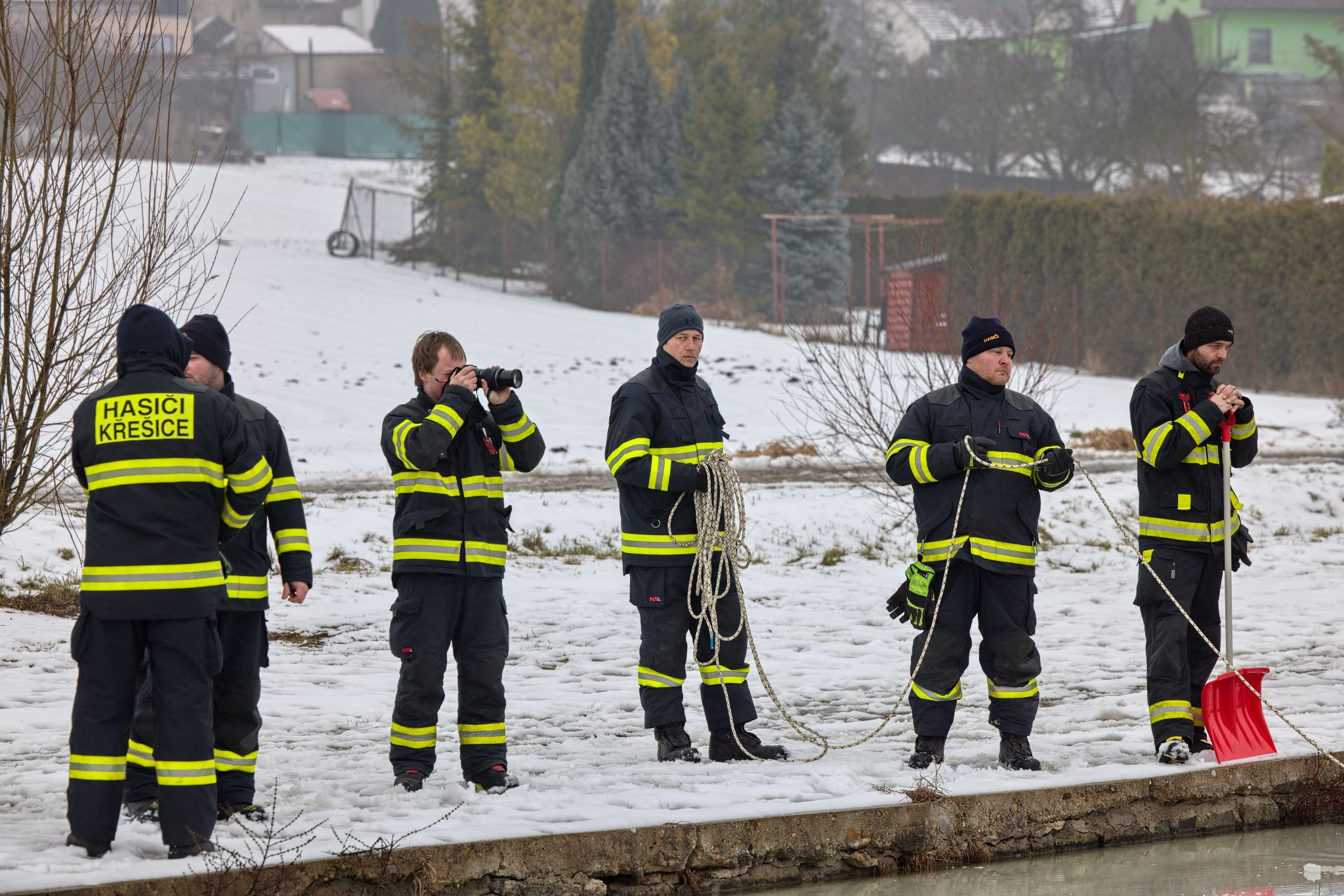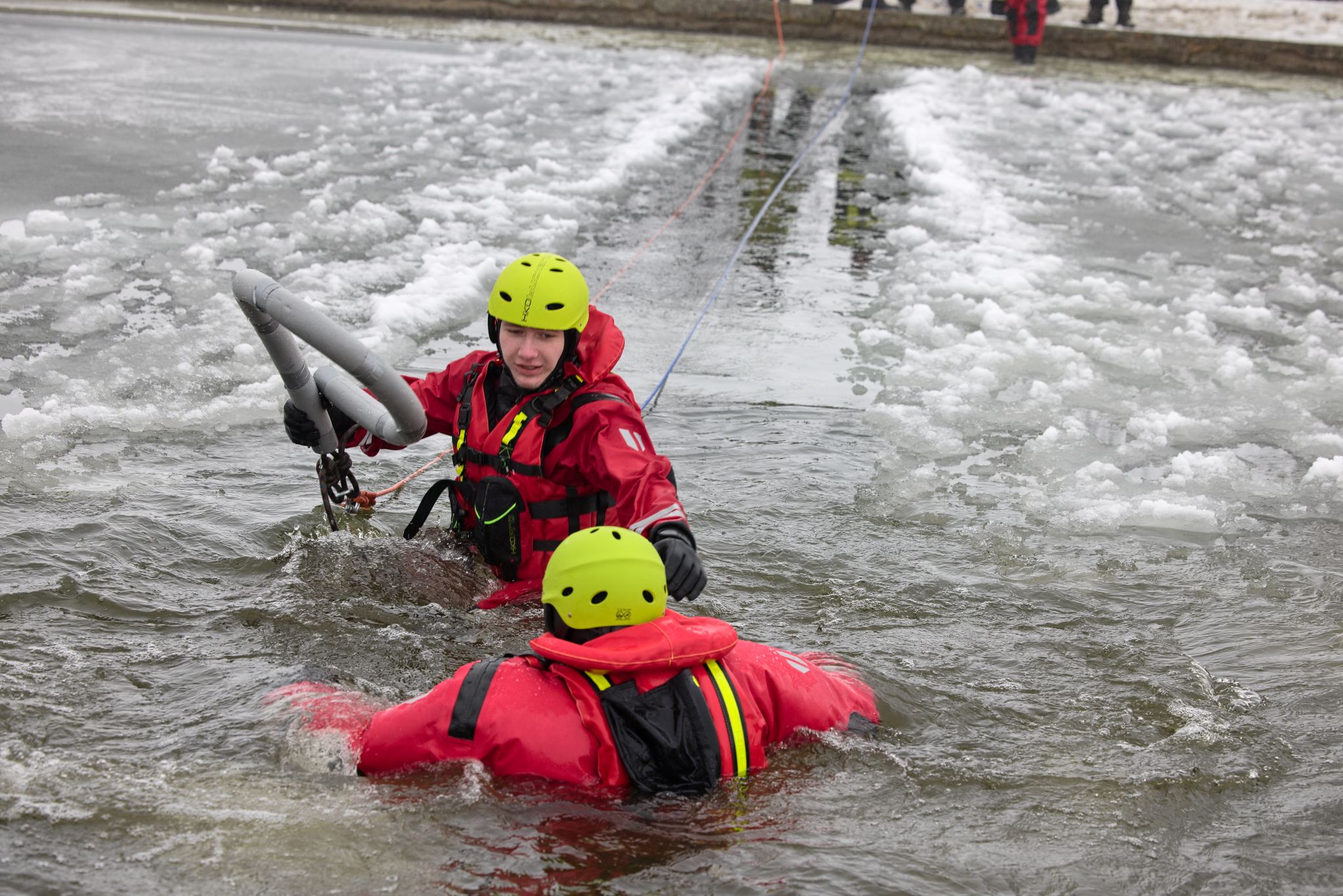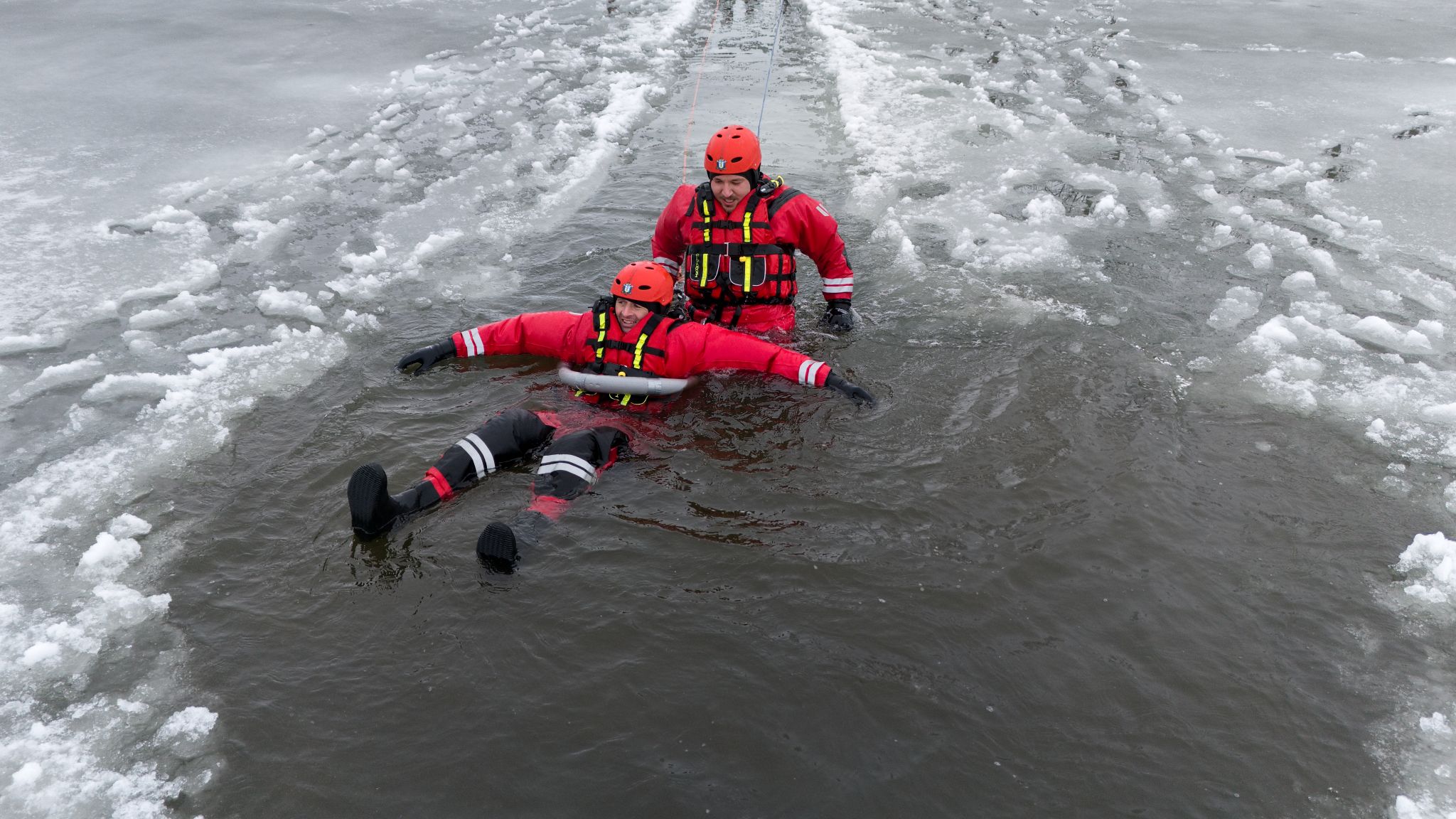 Po úvodu následovala praktická část. Hasiči si vysekali a vyřezali několik otvorů do ledu a rozdělili se do dvou skupin. Vzhledem k tomu, že led byl na řadě míst stále poměrně pevný, šla jedna z tras „za záchranou“ přes další otvor – aby se nasimulovalo druhé propadnutí a jednotky si vyzkoušely, jak rychle se situace může zkomplikovat.