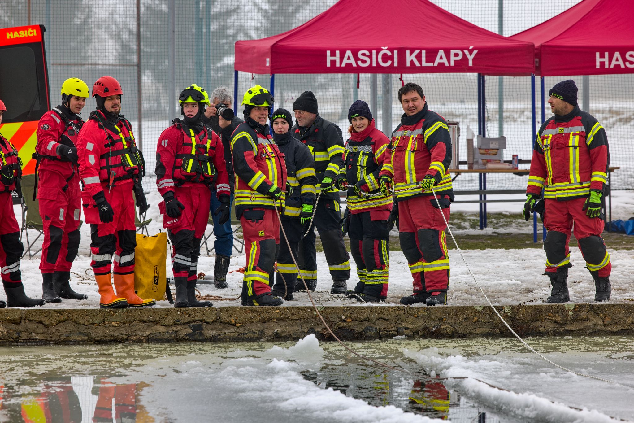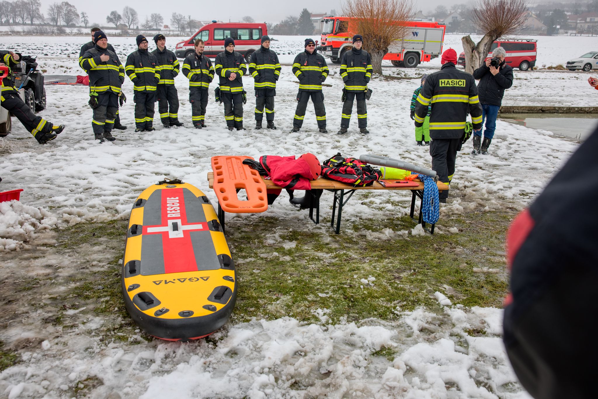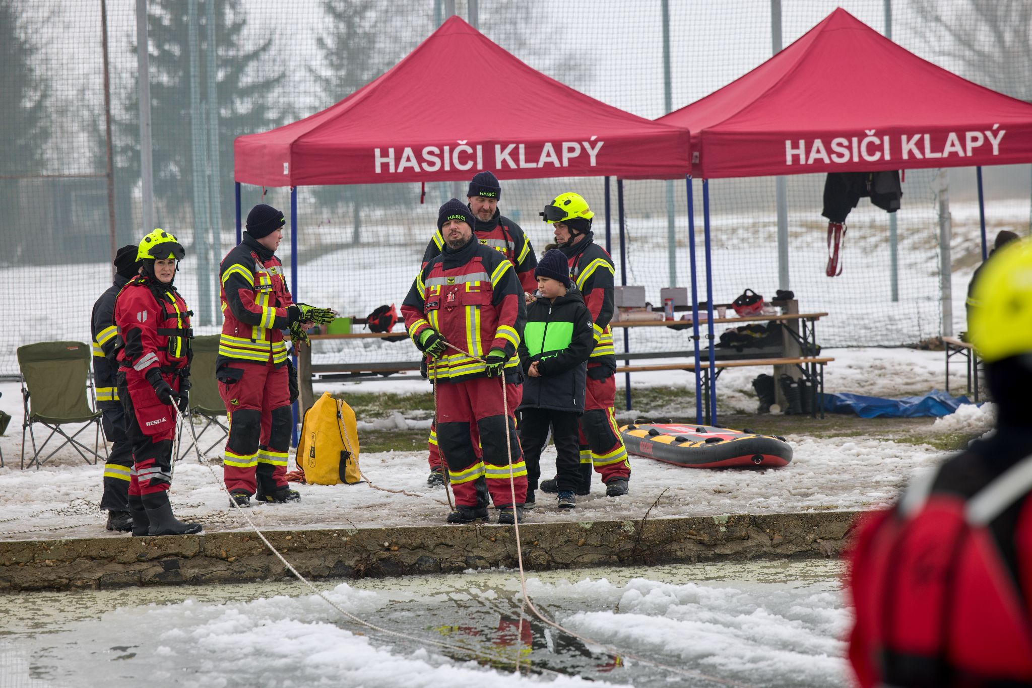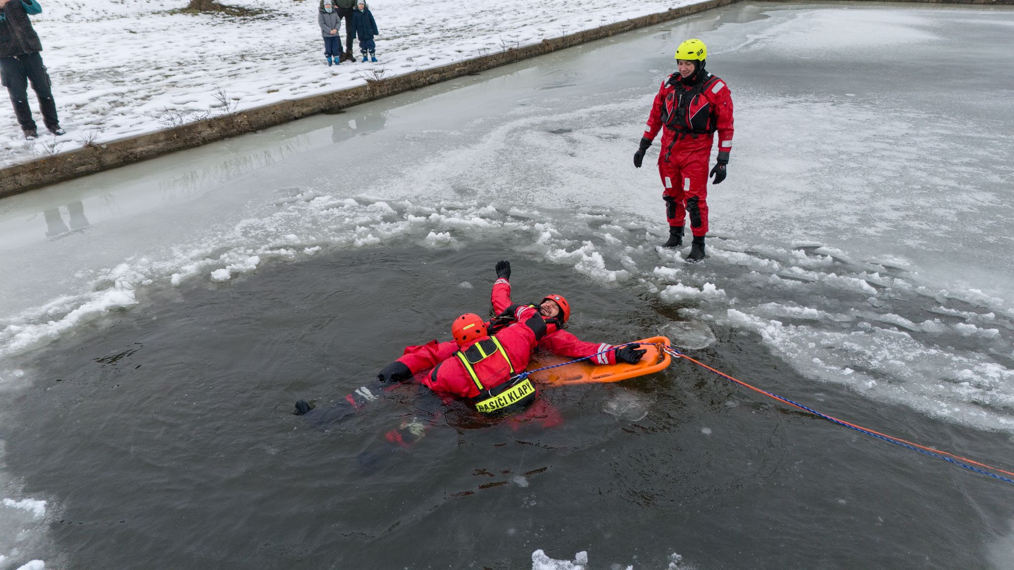 Na požární nádrži v Klapém se sešlo zhruba 30 dobrovolných hasičů ze čtyř jednotek Litoměřicka, aby si pod vedením dvou školitelů HZS Ústeckého kraje vyzkoušeli záchranu osoby z ledu – v reálných podmínkách oblevy, mokrého sněhu a vody o teplotě okolo 2 °C. Nechyběla instruktáž, porovnání vybavení ani netradiční pomůcky včetně rescue paddleboardu.