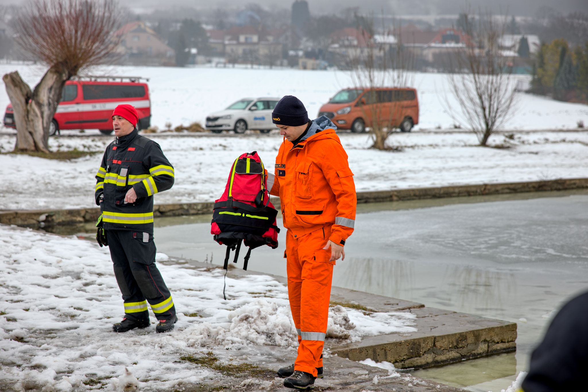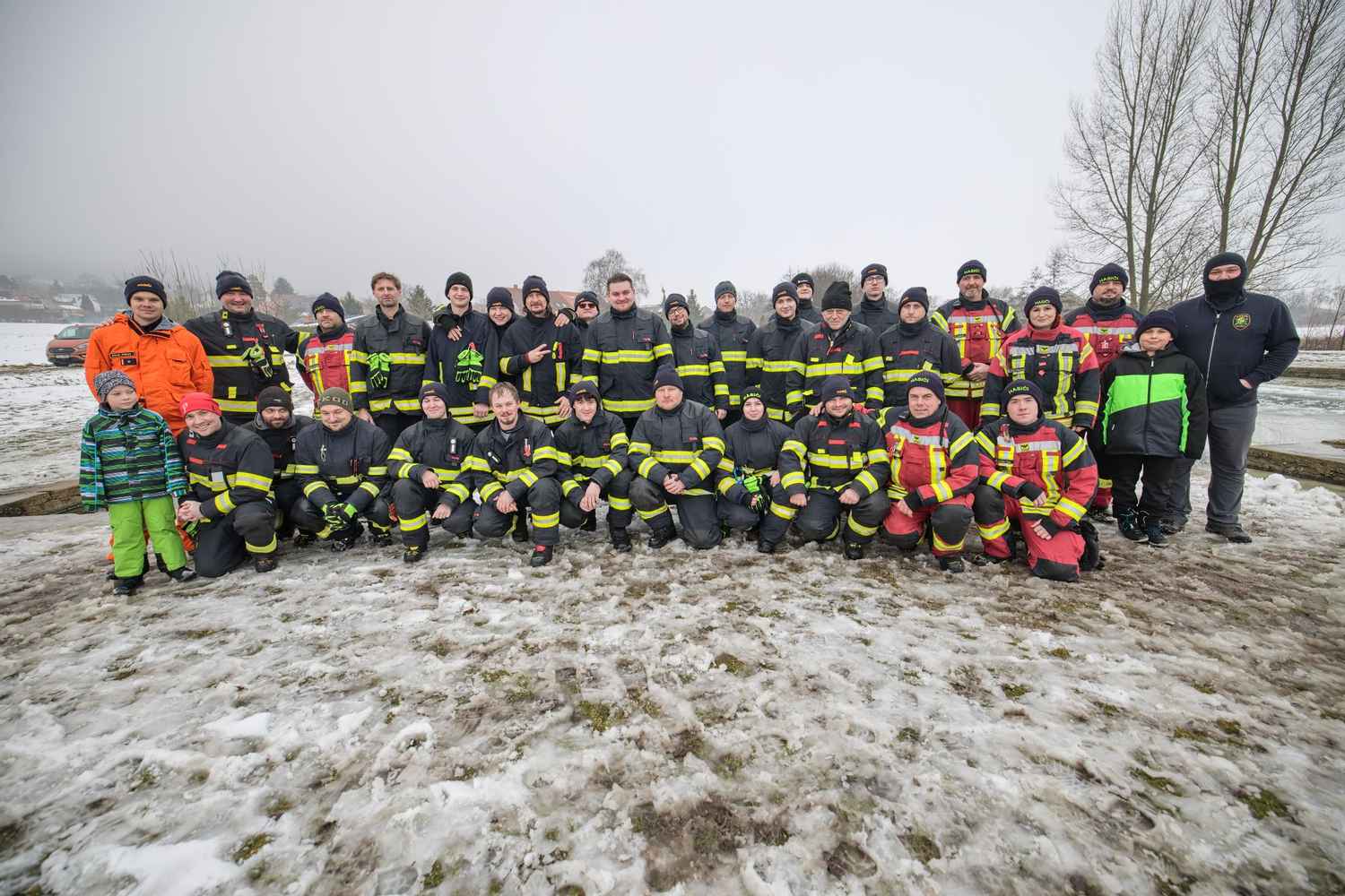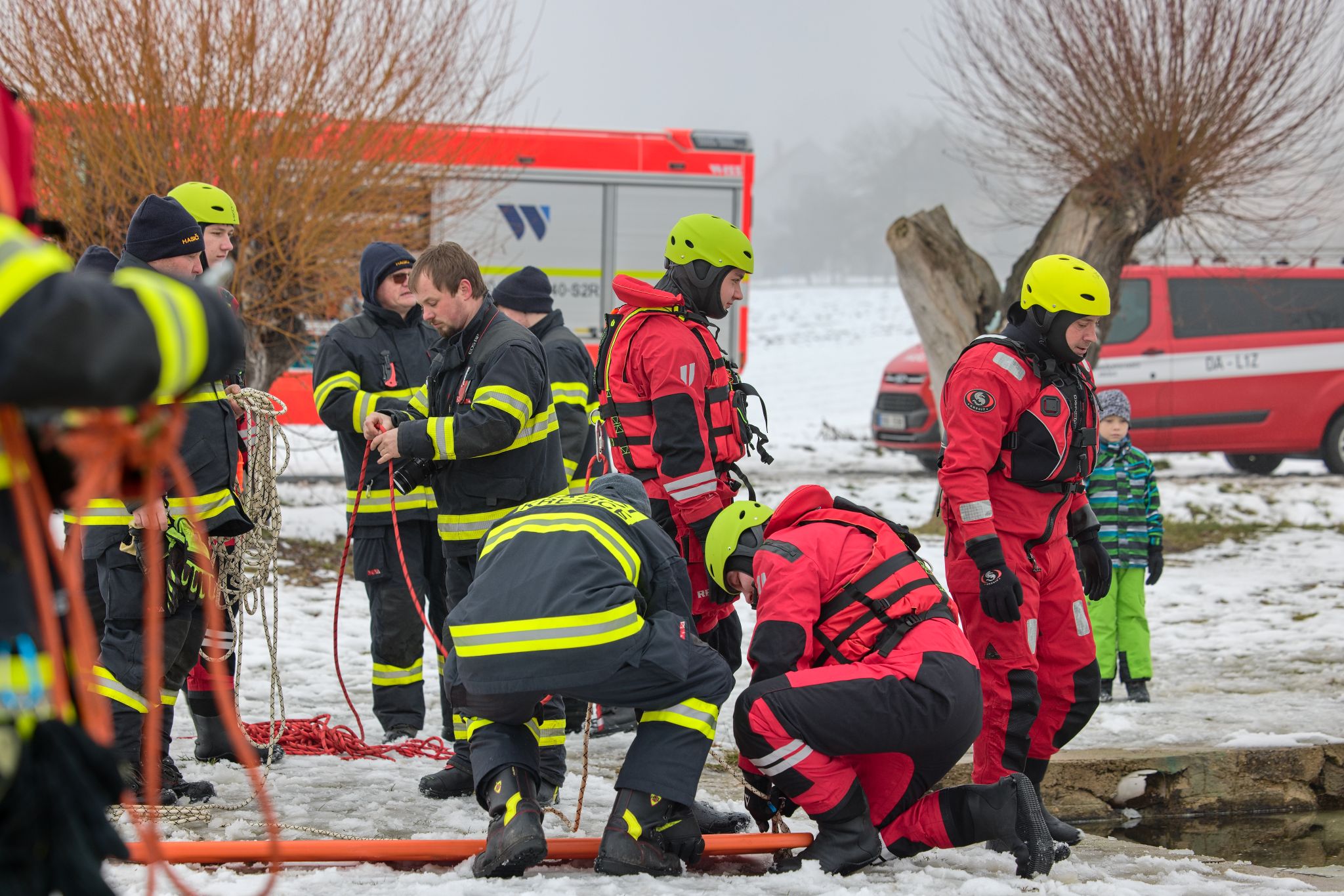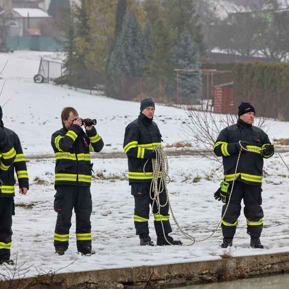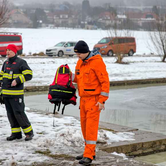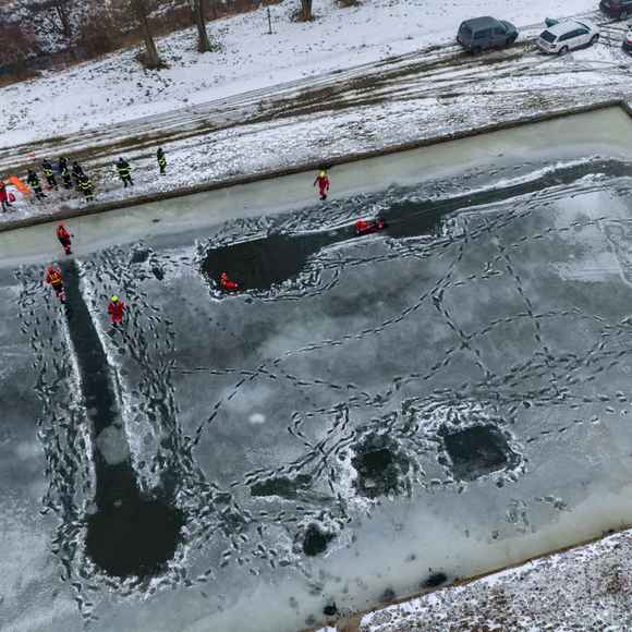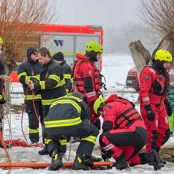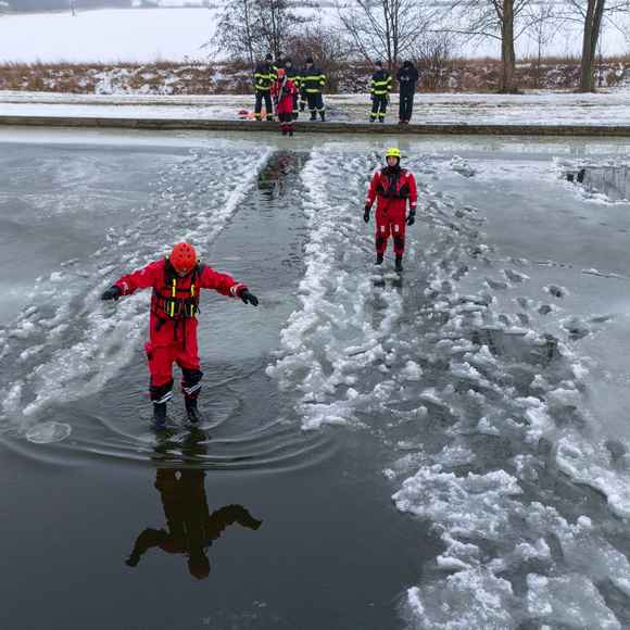 OBRAZEM: Záchrana z ledu v praxi: dobrovolné jednotky z Litoměřicka trénovaly na požární nádrži v Klapém
