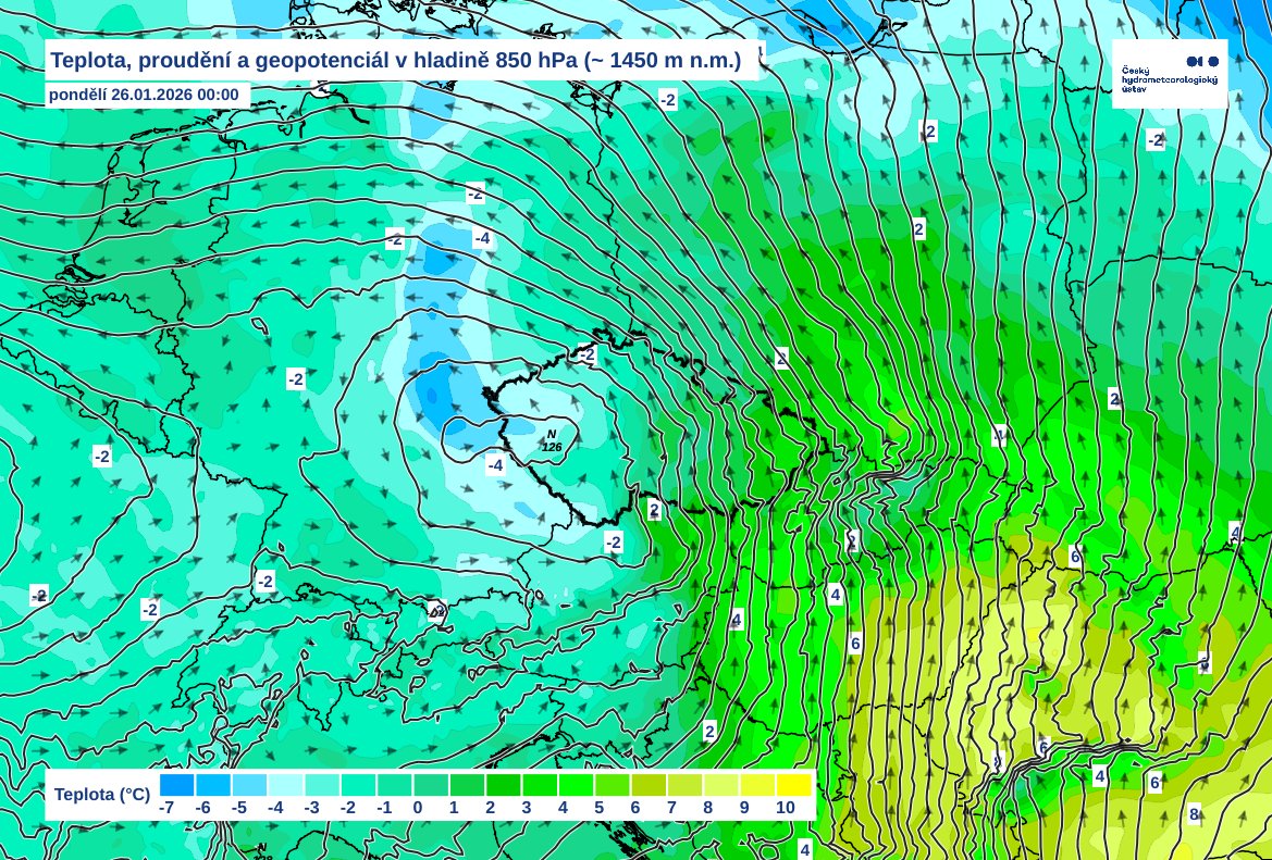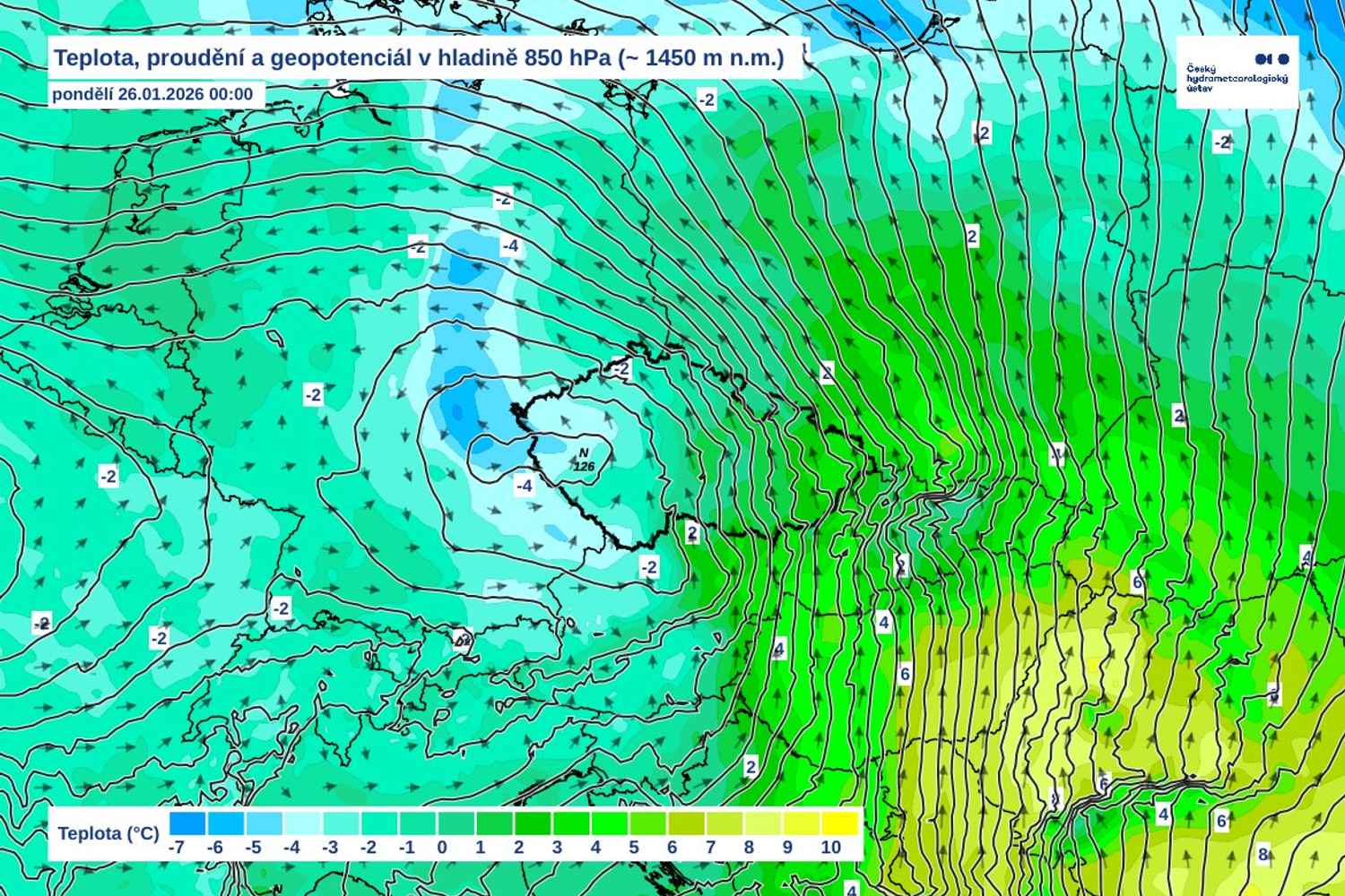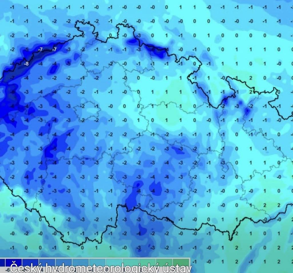 Teploty dnes vystoupí maximálně na −3 až +2 °C, v západní polovině Čech může být chladněji, kolem −5 °C. Na horách v nadmořské výšce kolem 1000 metrů se očekávají teploty okolo −3 °C, na Šumavě může být výjimečně až +2 °C. V noci bude nejchladněji právě v západních Čechách, kde mohou teploty klesnout na −6 až −10 °C, jinde se budou pohybovat mezi 0 až −5 °C. Během dne zůstane v západní části republiky často celodenní mráz, zatímco směrem na východ se může oteplovat až na 4 nebo 5 °C.